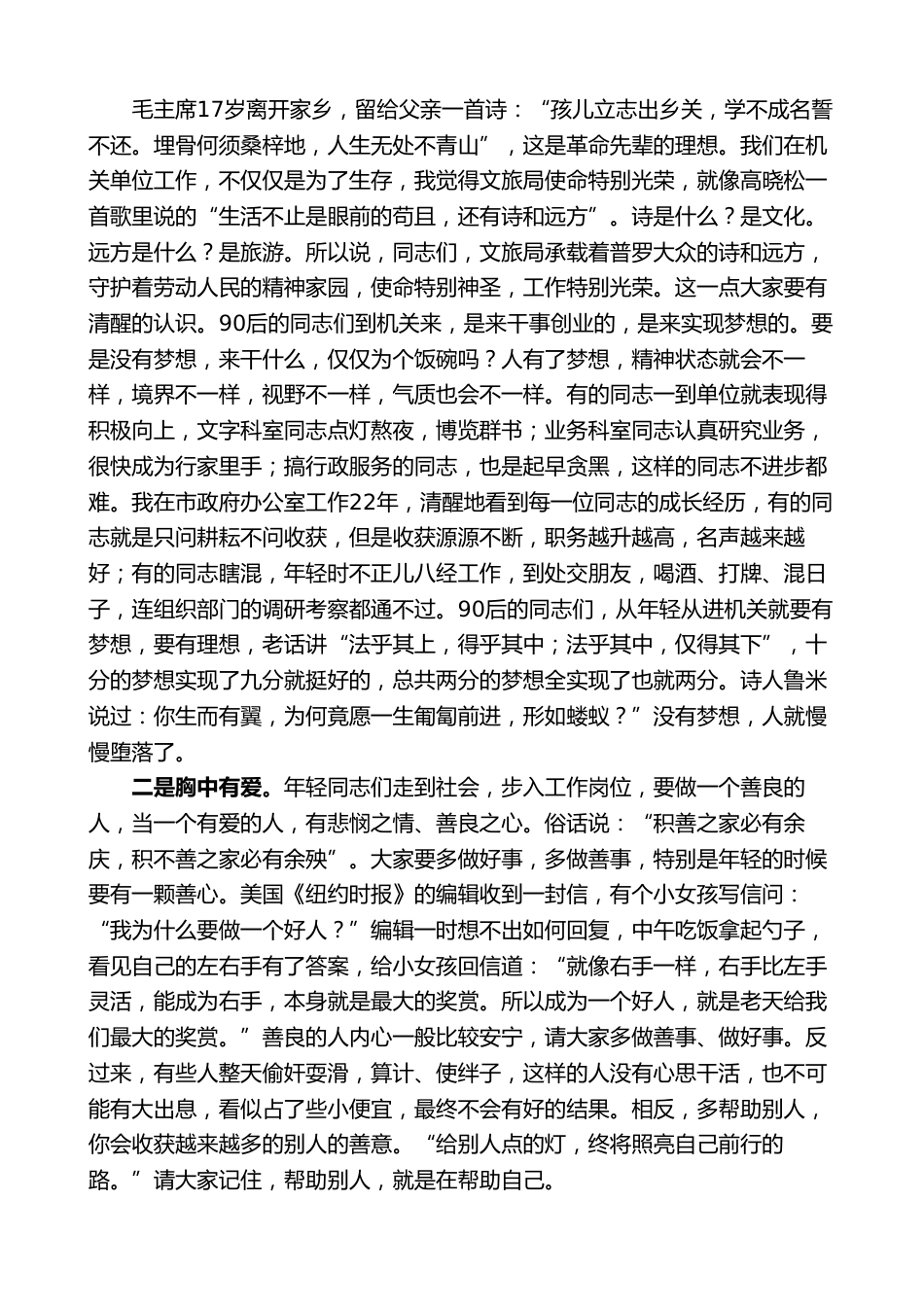 在市直文旅系統(tǒng)主題教育集體談心談話會議上的講話煙臺市文化和旅游局局長祝潛(2023年12月24日)根據(jù)黨組研究意見,今天上午召開市直文旅系統(tǒng)主題教育集體談心談話會議,主要是基于以下幾點(diǎn)考量:第一,主題教育進(jìn)入到檢視整改的關(guān)鍵時期,到了收官的階段,開展一次集體談心談話,以進(jìn)一步統(tǒng)一思想,鞏固主題教育成果。第二,我剛來局里工作,和大家深入交流一下思想。第三,根據(jù)我來文旅局這10多天所看所聽的一些情況,有必要把有些話說在前面,把思想攏一攏,把規(guī)矩定一定。從今天參會的年齡結(jié)構(gòu)上看,90后20人,80后32人,60后和70后48人。有必要針對不同年齡段同志們...
