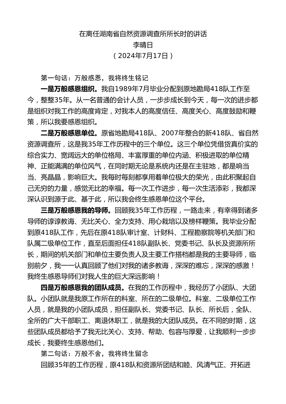 在離任湖南省自然資源調(diào)查所所長(zhǎng)時(shí)的講話(huà)李晴日(2024年7月17日)第一句話(huà):萬(wàn)般感恩,我將終生銘記一是萬(wàn)般感恩組織。我自1989年7月畢業(yè)分配到原地勘局418隊(duì)工作至今,整整35年。從一名普通的會(huì)計(jì)人員,一步步成長(zhǎng)到今天,每一次的進(jìn)步都是組織對(duì)我工作的高度肯定,對(duì)我本人的高度信任、高度關(guān)心、高度鼓勵(lì)和鞭策,所以我要感恩組織。二是萬(wàn)般感恩單位。原省地勘局418隊(duì)、2007年整合的新418隊(duì)、省自然資源調(diào)查所,這是我35年工作歷程中的三個(gè)單位。這三個(gè)單位憑借貨真價(jià)實(shí)的綜合實(shí)力、寬闊遠(yuǎn)大的單位格局、豐富厚重的單位內(nèi)涵、積極進(jìn)取的單位精神、正能滿(mǎn)滿(mǎn)的單位風(fēng)氣...