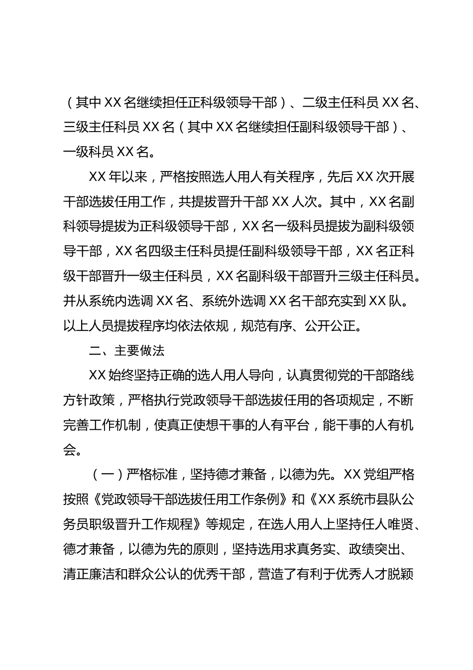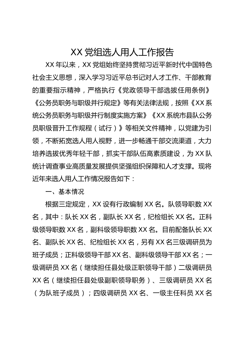 XX黨組選人用人工作報告XX年以來,XX黨組始終堅持貫徹習近平新時代中國特色社會主義思想,深入學習習近平總書記對人才工作、干部教育的重要指示精神,嚴格執(zhí)行《黨政領(lǐng)導干部選拔任用條例》《公務(wù)員職務(wù)與職級并行規(guī)定》等有關(guān)法律法規(guī),按照《XX系統(tǒng)公務(wù)員職務(wù)與職級并行制度實施方案》《XX系統(tǒng)市縣隊公務(wù)員職級晉升工作規(guī)程(試行)》等相關(guān)文件精神,以黨建為引領(lǐng),不斷拓寬選人用人視野,進一步暢通干部交流渠道,大力培養(yǎng)選拔優(yōu)秀年輕干部,抓實干部隊伍高素質(zhì)建設(shè),為XX隊統(tǒng)計調(diào)查事業(yè)高質(zhì)量發(fā)展提供堅強組織保障和人才支撐?,F(xiàn)將近年來選人用人工作情況報告如下:...