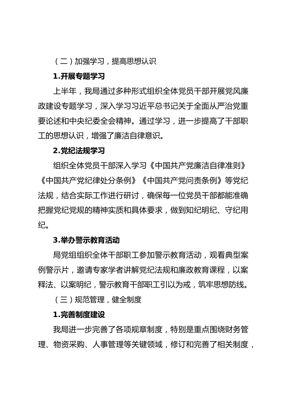 某局上半年貫徹落實黨風廉政建設責任制自查自糾報告2024年上半年,我局全面貫徹落實黨中央、國務院關于黨風廉政建設的決策部署,緊緊圍繞全面從嚴治黨的總體要求,深入推進黨風廉政建設責任制的貫徹落實。通過自查自糾,我們認真梳理總結了上半年在黨風廉政建設方面的工作進展和存在的問題,并提出了相應的改進措施。一、工作開展情況(一)強化領導,壓實責任1.領導重視,明確責任分工局黨組高度重視黨風廉政建設工作,始終把黨風廉政建設責任制作為重要工作來抓。年初,局黨組召開專題會議,研究部署黨風廉政建設工作,明確了各級領導干部的責任分工,制定了《2024年黨...