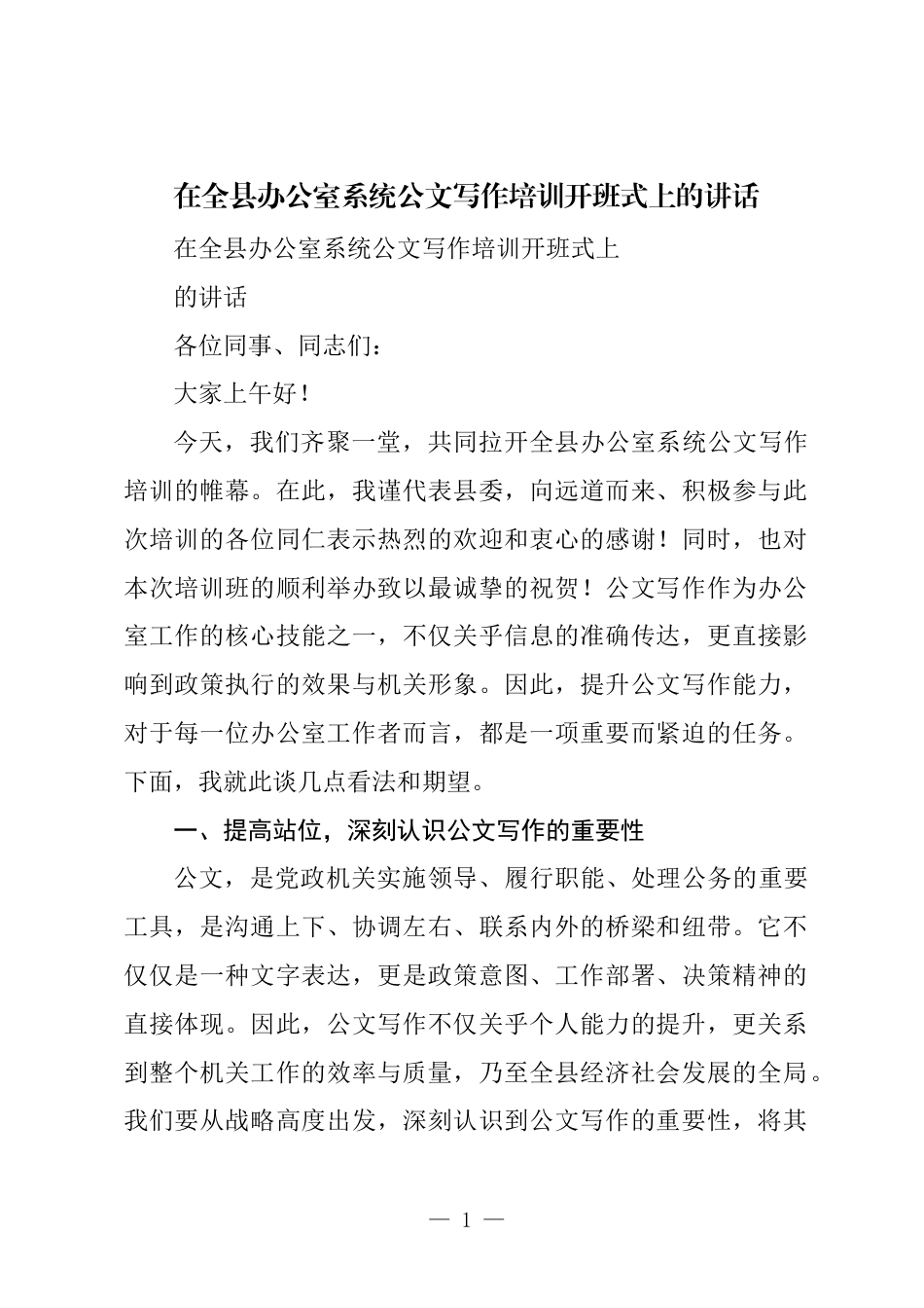 在全縣辦公室系統(tǒng)公文寫作培訓(xùn)開班式上的講話VIP免費