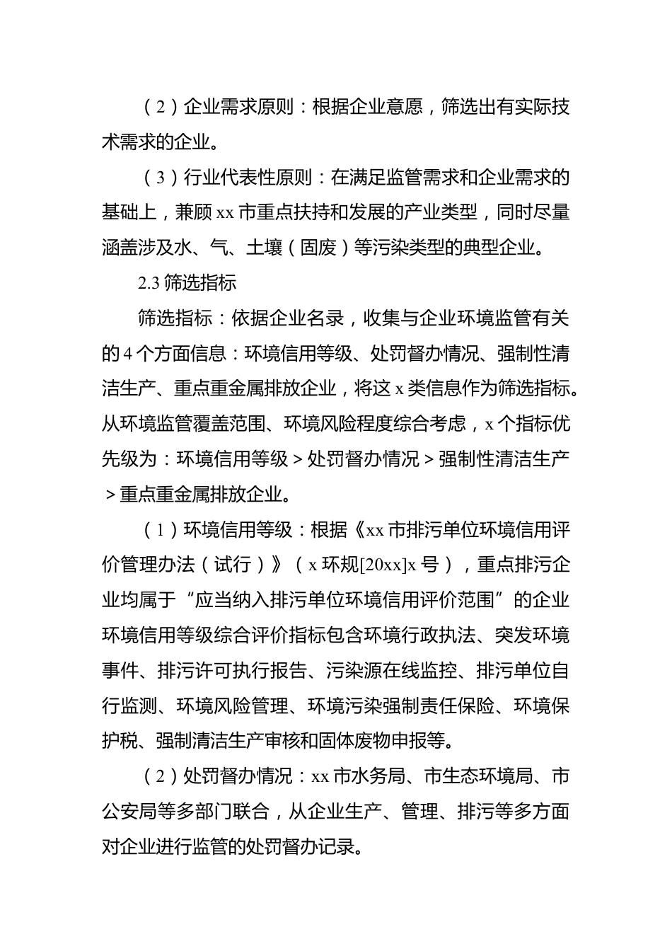 xx公司關(guān)于全市重點(diǎn)排污企業(yè)生態(tài)環(huán)境治理需求的調(diào)研報(bào)告(集團(tuán)公司)xx市產(chǎn)污企業(yè)數(shù)量巨大,污染物種類復(fù)雜,企業(yè)污染治理情況參差不齊。為了解企業(yè)治污過程中遇到的技術(shù)難點(diǎn)痛點(diǎn),幫助企業(yè)做好技術(shù)服務(wù)。借助研究課題的資源優(yōu)勢,20xx年x月xx市xx有限公司和xx市xx有限公司開展了xx市重點(diǎn)排污企業(yè)的調(diào)研工作。1.總體工作路線2.xx市重點(diǎn)排污企業(yè)篩選2.1篩選邊界以《xx市2021年重點(diǎn)排污單位名錄》(含水環(huán)境、大氣環(huán)境、土壤環(huán)境、其他環(huán)境四類名錄)中的企業(yè)為重點(diǎn)篩選對象;同時(shí)走訪生態(tài)環(huán)境管理部門(各區(qū)管理局、街道環(huán)保所等)、工業(yè)園區(qū)和行業(yè)協(xié)會,將其日常監(jiān)管或服...