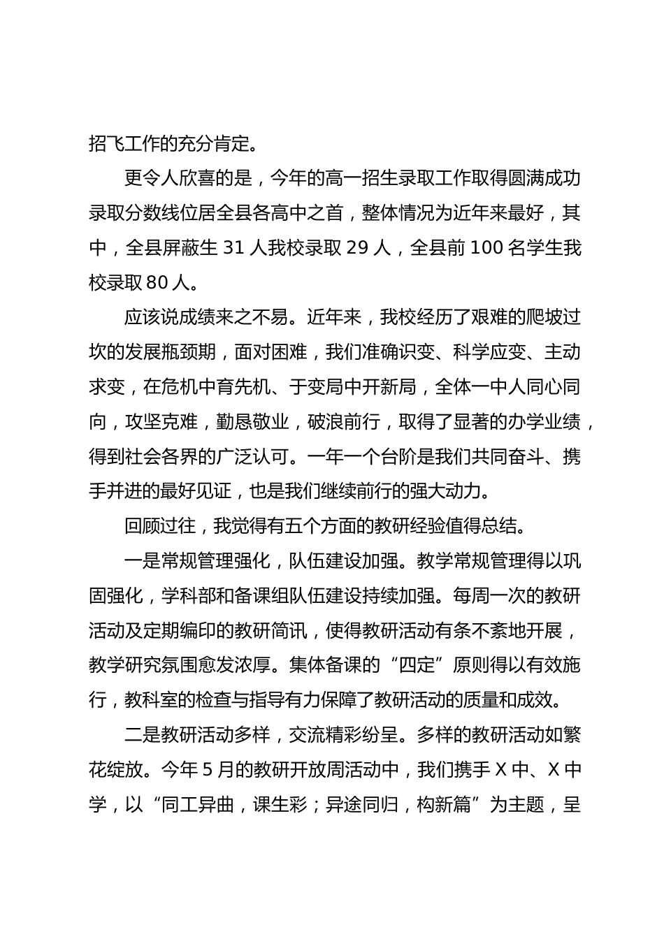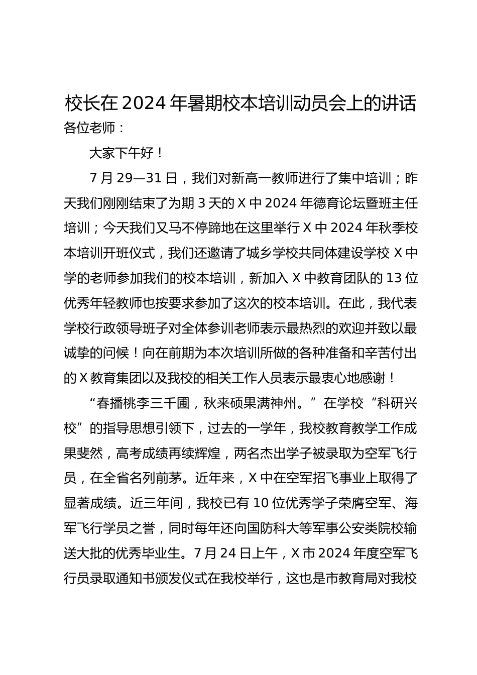 校長在2024年暑期校本培訓(xùn)動員會上的講話各位老師:大家下午好!7月29—31日,我們對新高一教師進行了集中培訓(xùn);昨天我們剛剛結(jié)束了為期3天的X中2024年德育論壇暨班主任培訓(xùn);今天我們又馬不停蹄地在這里舉行X中2024年秋季校本培訓(xùn)開班儀式,我們還邀請了城鄉(xiāng)學(xué)校共同體建設(shè)學(xué)校X中學(xué)的老師參加我們的校本培訓(xùn),新加入X中教育團隊的13位優(yōu)秀年輕教師也按要求參加了這次的校本培訓(xùn)。在此,我代表學(xué)校行政領(lǐng)導(dǎo)班子對全體參訓(xùn)老師表示最熱烈的歡迎并致以最誠摯的問候!向在前期為本次培訓(xùn)所做的各種準(zhǔn)備和辛苦付出的X教育集團以及我校的相關(guān)工作人員表示最衷心地感謝!“春...