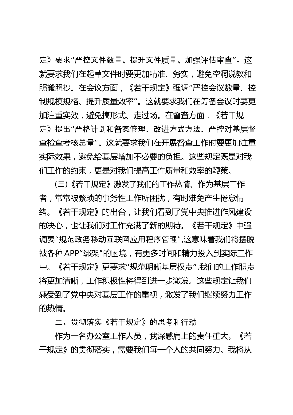 辦公室人員學(xué)習(xí)《整治形式主義為基層減負(fù)若干規(guī)定》心得體會(huì)作為**機(jī)關(guān)辦公室工作人員,當(dāng)我認(rèn)真學(xué)習(xí)了中共中央辦公廳、國(guó)務(wù)院辦公廳印發(fā)的《整治形式主義為基層減負(fù)若干規(guī)定》(以下簡(jiǎn)稱(chēng)《若干規(guī)定》)后,內(nèi)心充滿了激動(dòng)和期待。這份凝聚黨中央智慧的重要文件,既是對(duì)基層干部的關(guān)懷,也是對(duì)我們辦公室工作的有力指導(dǎo)。通過(guò)深入學(xué)習(xí),我深刻感受到黨中央堅(jiān)定不移全面從嚴(yán)治黨的決心,也更加明確了自己在整治形式主義、為基層減負(fù)中應(yīng)盡的責(zé)任。一、學(xué)習(xí)《若干規(guī)定》的深刻感受(一)《若干規(guī)定》體現(xiàn)了黨中央對(duì)基層的深切關(guān)懷。作為常年與文件、會(huì)議、督查等工作打交道的辦...