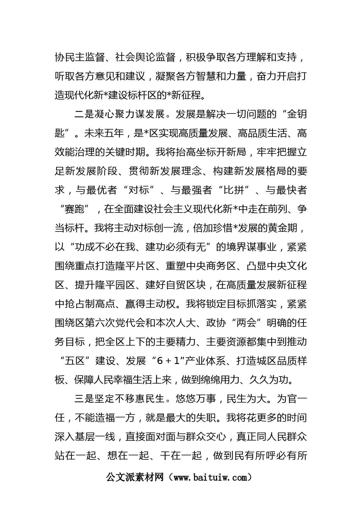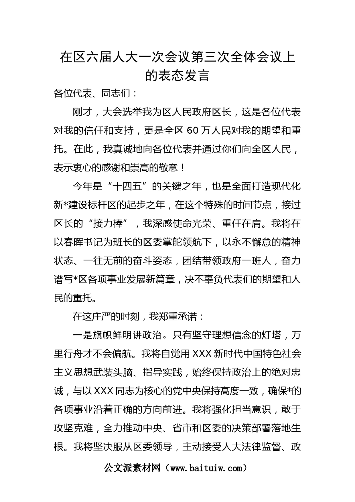 在區(qū)六屆人大一次會議第三次全體會議上的表態(tài)發(fā)言各位代表、同志們:剛才,大會選舉我為區(qū)人民政府區(qū)長,這是各位代表對我的信任和支持,更是全區(qū)60萬人民對我的期望和重托。在此,我真誠地向各位代表并通過你們向全區(qū)人民,表示衷心的感謝和崇高的敬意!今年是“十四五”的關(guān)鍵之年,也是全面打造現(xiàn)代化新建設(shè)標(biāo)桿區(qū)的起步之年,在這個特殊的時間節(jié)點,接過區(qū)長的“接力棒”,我深感使命光榮、重任在肩。我將在以春暉書記為班長的區(qū)委掌舵領(lǐng)航下,以永不懈怠的精神狀態(tài)、一往無前的奮斗姿態(tài),團(tuán)結(jié)帶領(lǐng)政府一班人,奮力譜寫區(qū)各項事業(yè)發(fā)展新篇章,決不辜負(fù)代表們的期望和...