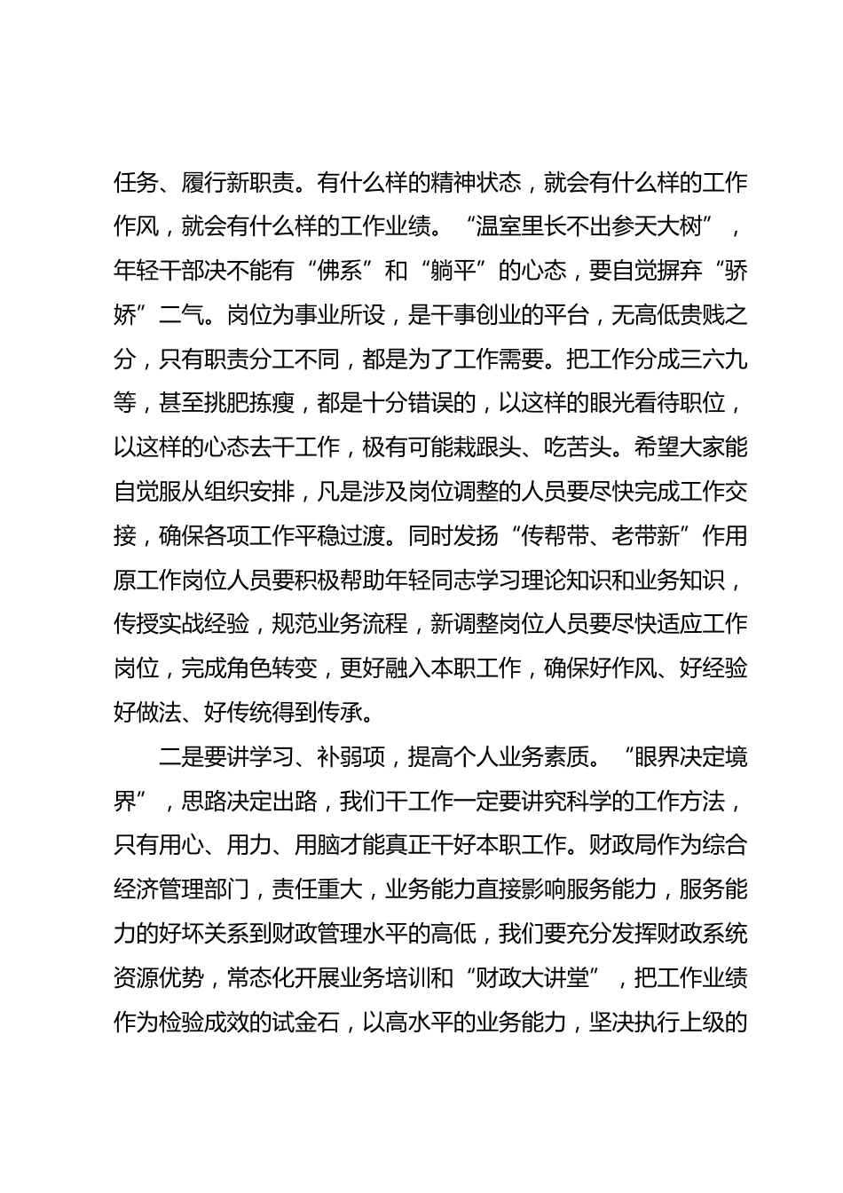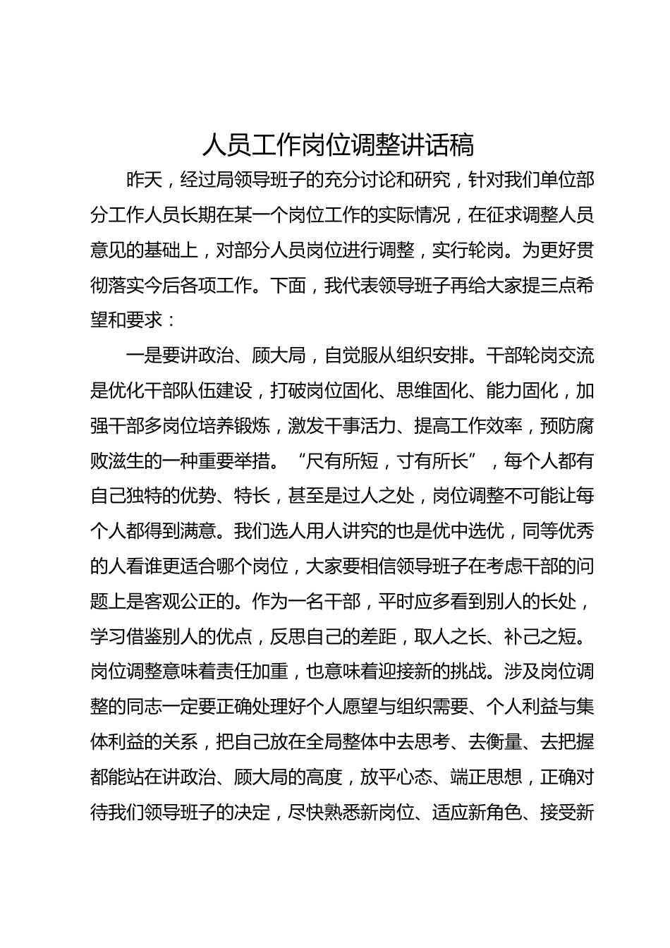 人員工作崗位調整講話稿昨天,經(jīng)過局領導班子的充分討論和研究,針對我們單位部分工作人員長期在某一個崗位工作的實際情況,在征求調整人員意見的基礎上,對部分人員崗位進行調整,實行輪崗。為更好貫徹落實今后各項工作。下面,我代表領導班子再給大家提三點希望和要求:一是要講政治、顧大局,自覺服從組織安排。干部輪崗交流是優(yōu)化干部隊伍建設,打破崗位固化、思維固化、能力固化,加強干部多崗位培養(yǎng)鍛煉,激發(fā)干事活力、提高工作效率,預防腐敗滋生的一種重要舉措?!俺哂兴?,寸有所長”,每個人都有自己獨特的優(yōu)勢、特長,甚至是過人之處,崗位調整不可能讓每個...