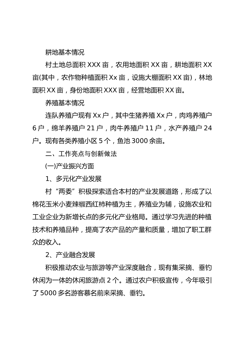 村支部書記參加“亮一亮、比一比,找差距補(bǔ)不足,明目標(biāo)勇爭(zhēng)先”活動(dòng)演講稿黨建領(lǐng)航,繪就鄉(xiāng)村振興新畫卷匯報(bào)人:XX村黨支部書記XXX各位領(lǐng)導(dǎo)、同志們大家好!我是XX村黨支部書記XXX,鄉(xiāng)村,是希望的田野,承載著無(wú)數(shù)的夢(mèng)想與憧憬。在新時(shí)代的征程中,黨建如同一盞明燈,照亮了鄉(xiāng)村振興的前行之路。今天,我給大家?guī)淼难葜v題目是《黨建領(lǐng)航,繪就鄉(xiāng)村振興新畫卷》。一、XX村基本情況XX村距離XX鎮(zhèn)13公里,東接XX村,南鄰143團(tuán)20連,西連XX縣烏蘭烏蘇鄉(xiāng)X隊(duì),北抵XX村,交通條件便利。村里人口主要以漢族為主,常住人口330戶720人,戶籍人口391戶925人,“兩委”職數(shù)5名。...