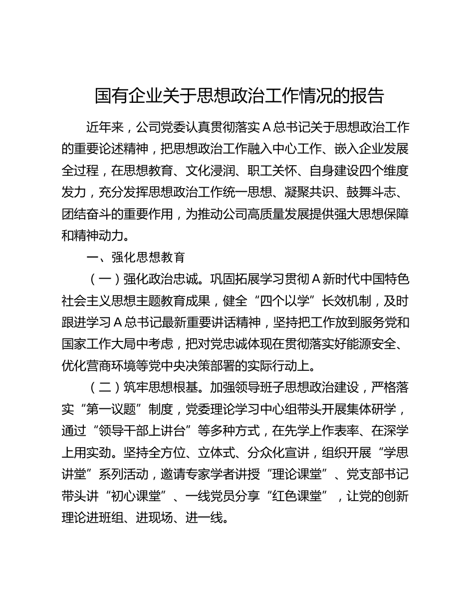 國有企業(yè)關(guān)于思想政治工作情況的報告近年來,公司黨委認(rèn)真貫徹落實(shí)A總書記關(guān)于思想政治工作的重要論述精神,把思想政治工作融入中心工作、嵌入企業(yè)發(fā)展全過程,在思想教育、文化浸潤、職工關(guān)懷、自身建設(shè)四個維度發(fā)力,充分發(fā)揮思想政治工作統(tǒng)一思想、凝聚共識、鼓舞斗志、團(tuán)結(jié)奮斗的重要作用,為推動公司高質(zhì)量發(fā)展提供強(qiáng)大思想保障和精神動力。一、強(qiáng)化思想教育(一)強(qiáng)化政治忠誠。鞏固拓展學(xué)習(xí)貫徹A新時代中國特色社會主義思想主題教育成果,健全“四個以學(xué)”長效機(jī)制,及時跟進(jìn)學(xué)習(xí)A總書記最新重要講話精神,堅(jiān)持把工作放到服務(wù)黨和國家工作大局中考慮,把對黨忠誠...