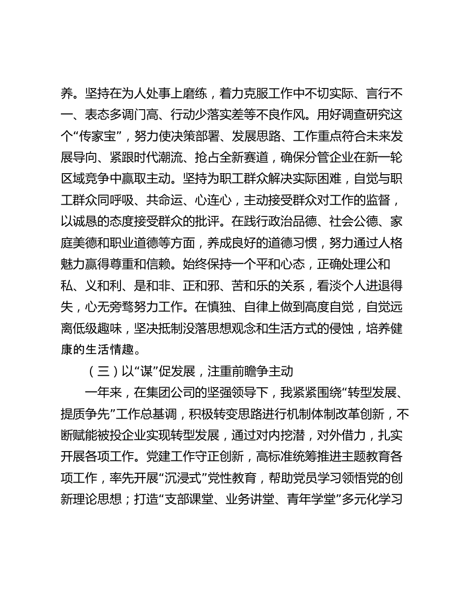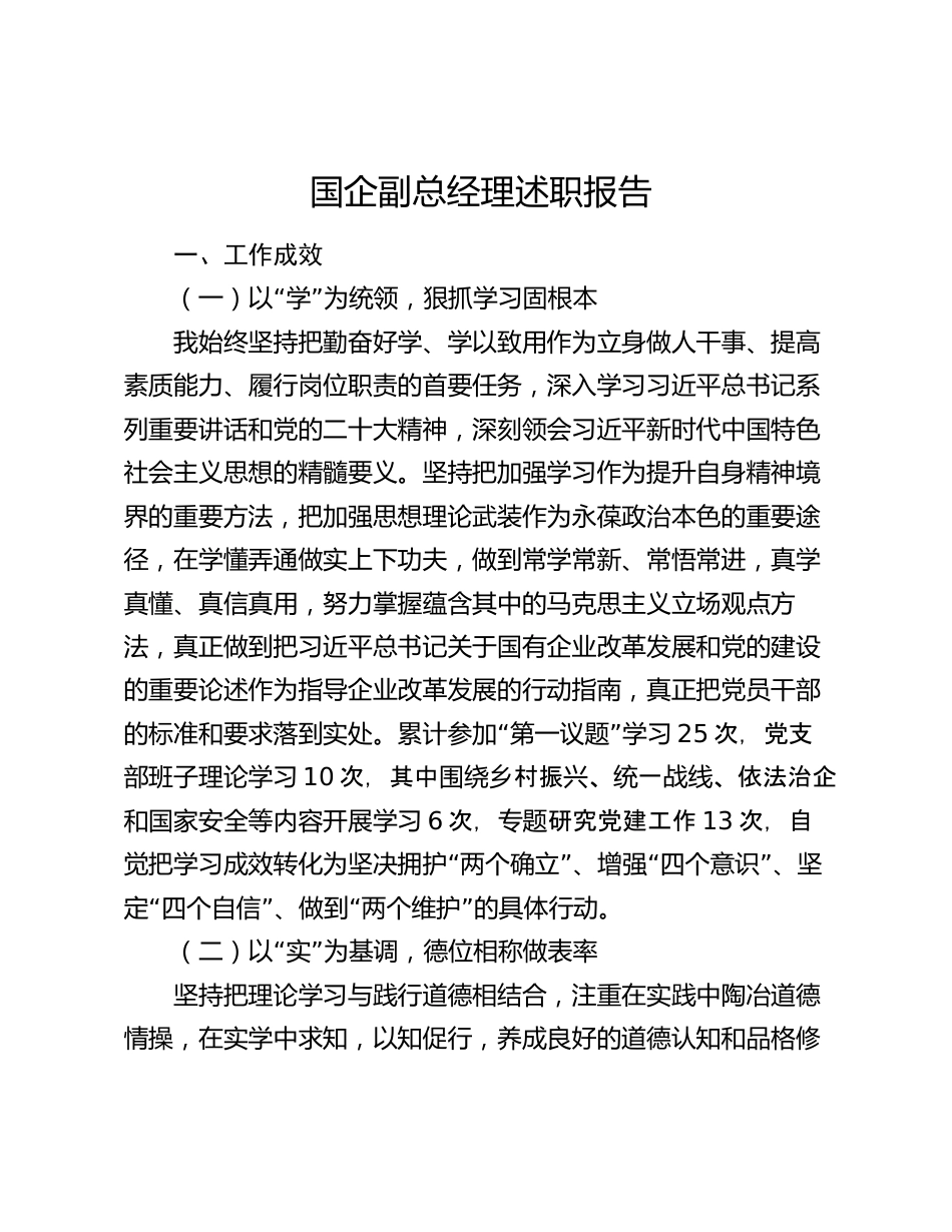 國企副總經(jīng)理述職報(bào)告一、工作成效“”(一)以學(xué)為統(tǒng)領(lǐng),狠抓學(xué)習(xí)固根本我始終堅(jiān)持把勤奮好學(xué)、學(xué)以致用作為立身做人干事、提高素質(zhì)能力、履行崗位職責(zé)的首要任務(wù),深入學(xué)習(xí)習(xí)近平總書記系列重要講話和黨的二十大精神,深刻領(lǐng)會(huì)習(xí)近平新時(shí)代中國特色社會(huì)主義思想的精髓要義。堅(jiān)持把加強(qiáng)學(xué)習(xí)作為提升自身精神境界的重要方法,把加強(qiáng)思想理論武裝作為永葆政治本色的重要途徑,在學(xué)懂弄通做實(shí)上下功夫,做到常學(xué)常新、常悟常進(jìn),真學(xué)真懂、真信真用,努力掌握蘊(yùn)含其中的馬克思主義立場(chǎng)觀點(diǎn)方法,真正做到把習(xí)近平總書記關(guān)于國有企業(yè)改革發(fā)展和黨的建設(shè)的重要論述作為指導(dǎo)企...