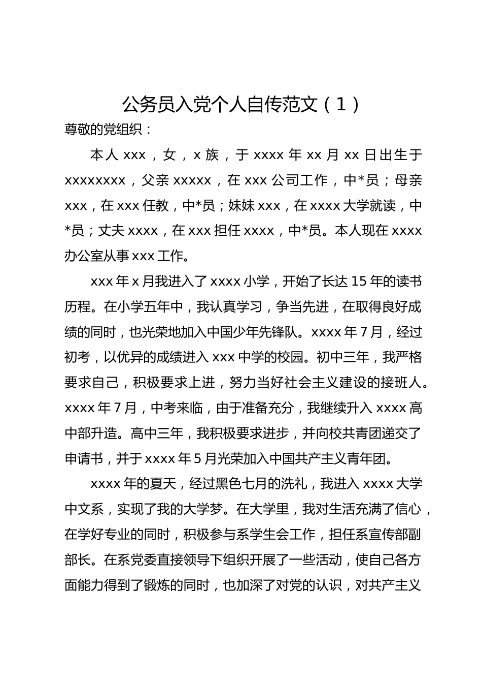 公務員入黨個人自傳范文(1)尊敬的黨組織:本人xxx,女,x族,于xxxx年xx月xx日出生于xxxxxxxx,父親xxxxx,在xxx公司工作,中*員;母親xxx,在xxx任教,中*員;妹妹xxx,在xxxx大學就讀,中*員;丈夫xxxx,在xxx擔任xxxx,中*員。本人現在xxxx辦公室從事xxx工作。xxx年x月我進入了xxxx小學,開始了長達15年的讀書歷程。在小學五年中,我認真學習,爭當先進,在取得良好成績的同時,也光榮地加入中國少年先鋒隊。xxxx年7月,經過初考,以優(yōu)異的成績進入xxx中學的校園。初中三年,我嚴格要求自己,積極要求上進,努力當好社會主義建設的接班人。xxxx年7月,中考來臨,由...