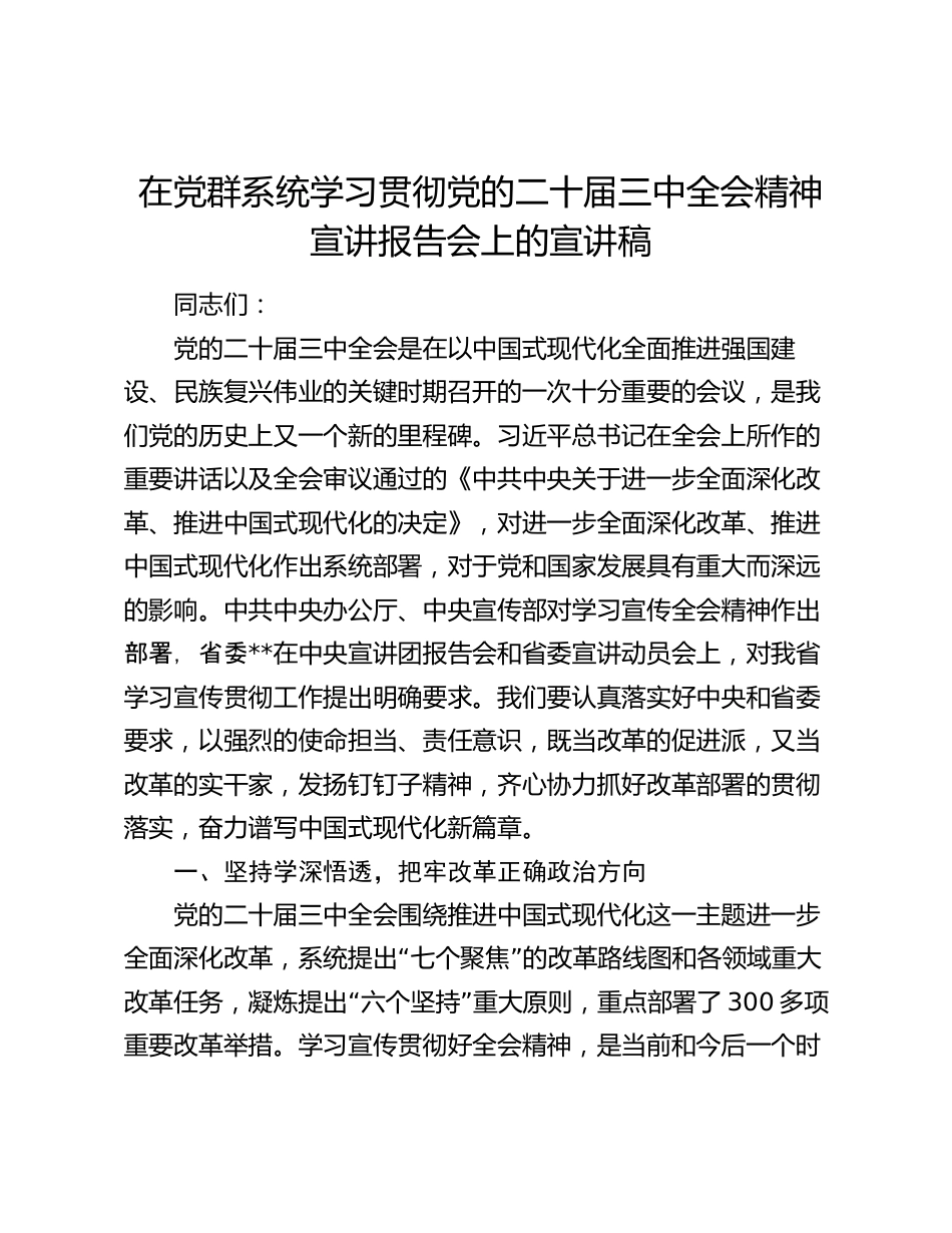 在黨群系統(tǒng)學(xué)習(xí)貫徹黨的二十屆三中全會精神宣講報告會上的宣講稿VIP免費