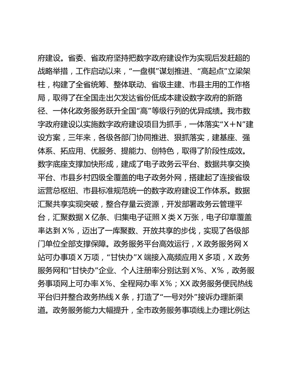 “”在加強數(shù)字政府建設推進高效辦成一件事工作會議上的講話同志們:“今天我們召開全市加強數(shù)字政府建設推進高效辦成一件”事工作會議,主要任務是深入學習貫徹習近平總書記關于網(wǎng)絡強國的重要思想和數(shù)字中國建設的重要論述,全面落實黨中央、國“務院和省委、省政府關于加強數(shù)字政府建設推進高效辦成一件”“”事的決策部署,動員各級各部門樹立一把手工程意識,增強責任感、明確主攻點、凝聚推動力,以更大力度深化數(shù)字政府建“”設、更實舉措推進高效辦成一件事,以數(shù)字政府建設加力提效賦能經(jīng)濟社會高質量發(fā)展。剛才,通報了全市數(shù)字政府建設、數(shù)字政府服務能力綜合...