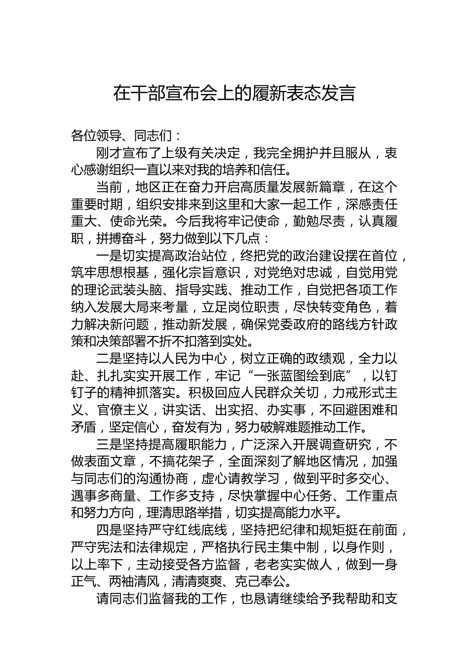 在干部宣布會上的履新表態(tài)發(fā)言各位領(lǐng)導(dǎo)、同志們:剛才宣布了上級有關(guān)決定,我完全擁護并且服從,衷心感謝組織一直以來對我的培養(yǎng)和信任。當前,地區(qū)正在奮力開啟高質(zhì)量發(fā)展新篇章,在這個重要時期,組織安排來到這里和大家一起工作,深感責任重大、使命光榮。今后我將牢記使命,勤勉盡責,認真履職,拼搏奮斗,努力做到以下幾點:一是切實提高政治站位,終把黨的政治建設(shè)擺在首位,筑牢思想根基,強化宗旨意識,對黨絕對忠誠,自覺用黨的理論武裝頭腦、指導(dǎo)實踐、推動工作,自覺把各項工作納入發(fā)展大局來考量,立足崗位職責,盡快轉(zhuǎn)變角色,著力解決新問題,推動新發(fā)展,...