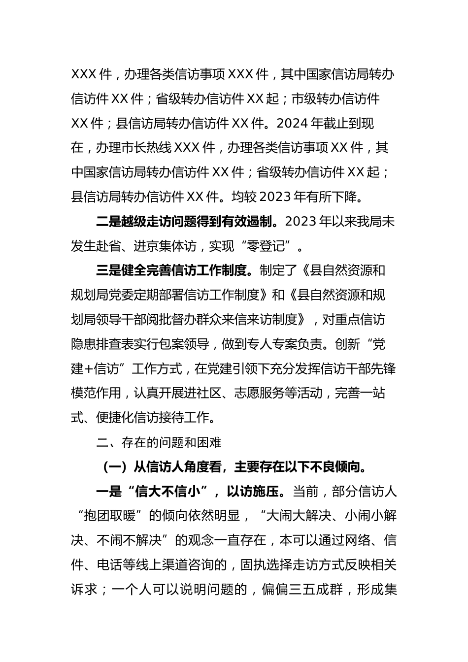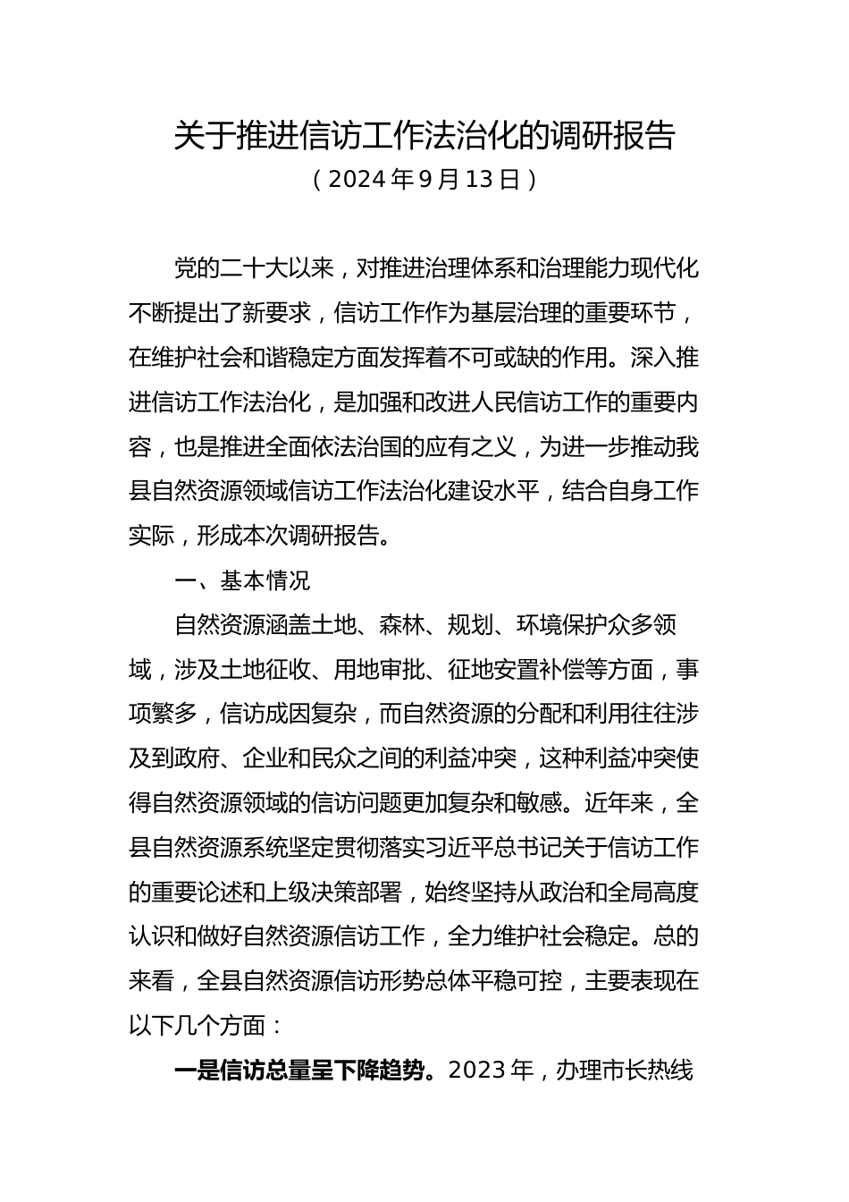 關(guān)于推進(jìn)信訪工作法治化的調(diào)研報(bào)告(2024年9月13日)黨的二十大以來,對(duì)推進(jìn)治理體系和治理能力現(xiàn)代化不斷提出了新要求,信訪工作作為基層治理的重要環(huán)節(jié),在維護(hù)社會(huì)和諧穩(wěn)定方面發(fā)揮著不可或缺的作用。深入推進(jìn)信訪工作法治化,是加強(qiáng)和改進(jìn)人民信訪工作的重要內(nèi)容,也是推進(jìn)全面依法治國的應(yīng)有之義,為進(jìn)一步推動(dòng)我縣自然資源領(lǐng)域信訪工作法治化建設(shè)水平,結(jié)合自身工作實(shí)際,形成本次調(diào)研報(bào)告。一、基本情況自然資源涵蓋土地、森林、規(guī)劃、環(huán)境保護(hù)眾多領(lǐng)域,涉及土地征收、用地審批、征地安置補(bǔ)償?shù)确矫?,事?xiàng)繁多,信訪成因復(fù)雜,而自然資源的分配和利用往往涉及到...