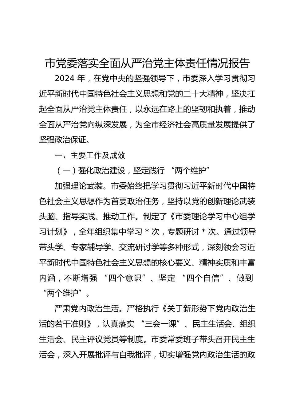 市黨委落實(shí)全面從嚴(yán)治黨主體責(zé)任情況報(bào)告2024年,在黨中央的堅(jiān)強(qiáng)領(lǐng)導(dǎo)下,市委深入學(xué)習(xí)貫徹習(xí)近平新時(shí)代中國(guó)特色社會(huì)主義思想和黨的二十大精神,堅(jiān)決扛起全面從嚴(yán)治黨主體責(zé)任,以永遠(yuǎn)在路上的堅(jiān)韌和執(zhí)著,推動(dòng)全面從嚴(yán)治黨向縱深發(fā)展,為全市經(jīng)濟(jì)社會(huì)高質(zhì)量發(fā)展提供了堅(jiān)強(qiáng)政治保證。一、主要工作及成效(一)強(qiáng)化政治建設(shè),堅(jiān)定踐行“兩個(gè)維護(hù)”加強(qiáng)理論武裝。市委始終把學(xué)習(xí)貫徹習(xí)近平新時(shí)代中國(guó)特色社會(huì)主義思想作為首要政治任務(wù),堅(jiān)持以黨的創(chuàng)新理論武裝頭腦、指導(dǎo)實(shí)踐、推動(dòng)工作。制定了《市委理論學(xué)習(xí)中心組學(xué)習(xí)計(jì)劃》,全年組織集中學(xué)習(xí)*次,專(zhuān)題研討*次。通過(guò)領(lǐng)導(dǎo)...