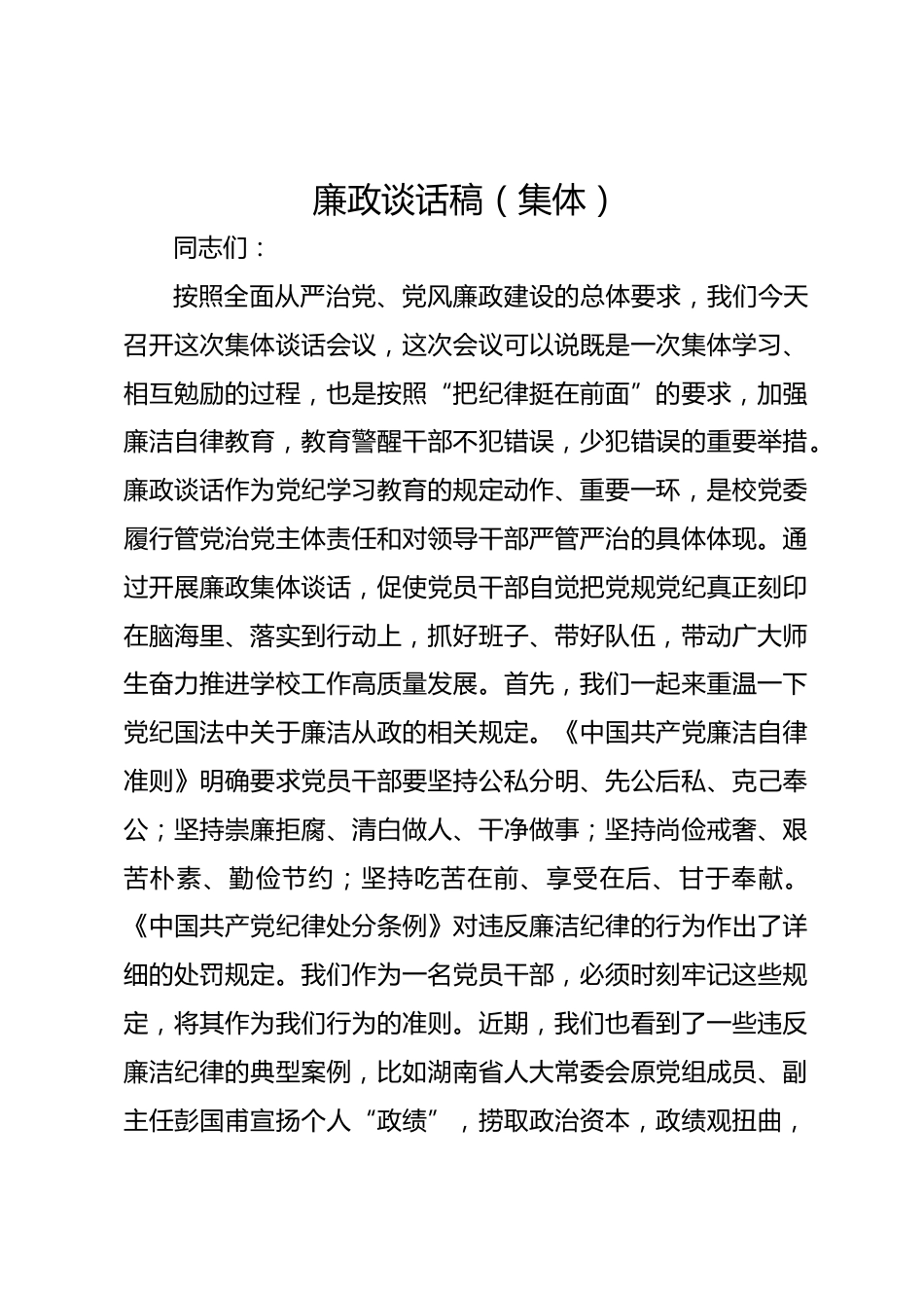 廉政談話稿(集體)同志們:按照全面從嚴治黨、黨風廉政建設的總體要求,我們今天召開這次集體談話會議,這次會議可以說既是一次集體學習、相互勉勵的過程,也是按照“把紀律挺在前面”的要求,加強廉潔自律教育,教育警醒干部不犯錯誤,少犯錯誤的重要舉措。廉政談話作為黨紀學習教育的規(guī)定動作、重要一環(huán),是校黨委履行管黨治黨主體責任和對領導干部嚴管嚴治的具體體現(xiàn)。通過開展廉政集體談話,促使黨員干部自覺把黨規(guī)黨紀真正刻印在腦海里、落實到行動上,抓好班子、帶好隊伍,帶動廣大師生奮力推進學校工作高質(zhì)量發(fā)展。首先,我們一起來重溫一下黨紀國法中關于廉潔從...
