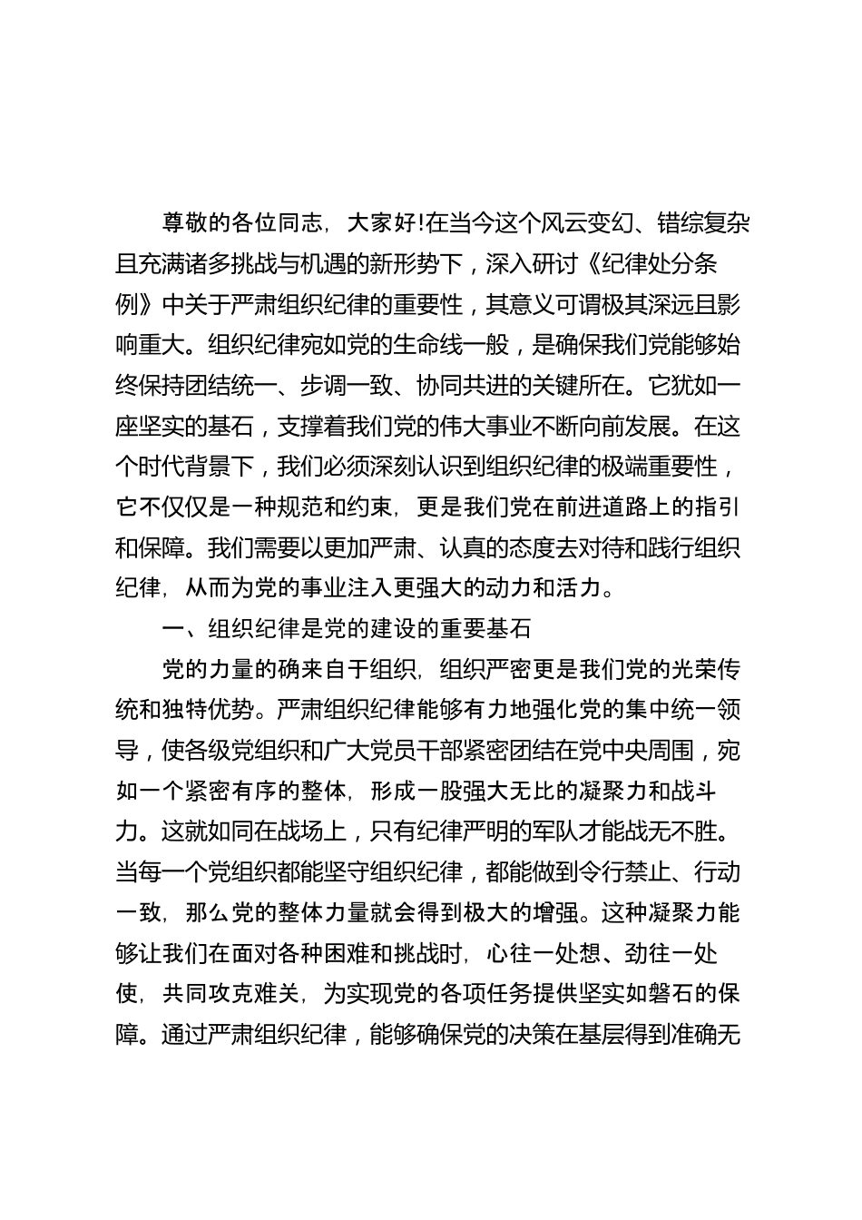 尊敬的各位同志,大家好!在當(dāng)今這個(gè)風(fēng)云變幻、錯(cuò)綜復(fù)雜且充滿諸多挑戰(zhàn)與機(jī)遇的新形勢(shì)下,深入研討《紀(jì)律處分條例》中關(guān)于嚴(yán)肅組織紀(jì)律的重要性,其意義可謂極其深遠(yuǎn)且影響重大。組織紀(jì)律宛如黨的生命線一般,是確保我們黨能夠始終保持團(tuán)結(jié)統(tǒng)一、步調(diào)一致、協(xié)同共進(jìn)的關(guān)鍵所在。它猶如一座堅(jiān)實(shí)的基石,支撐著我們黨的偉大事業(yè)不斷向前發(fā)展。在這個(gè)時(shí)代背景下,我們必須深刻認(rèn)識(shí)到組織紀(jì)律的極端重要性,它不是一種范和束,更是我黨在前道路上的指引僅僅規(guī)約們進(jìn)和保障。我們需要以更加嚴(yán)肅、認(rèn)真的態(tài)度去對(duì)待和踐行組織律,從而黨的事注入更大的力和活力。紀(jì)為業(yè)強(qiáng)動(dòng)一、...