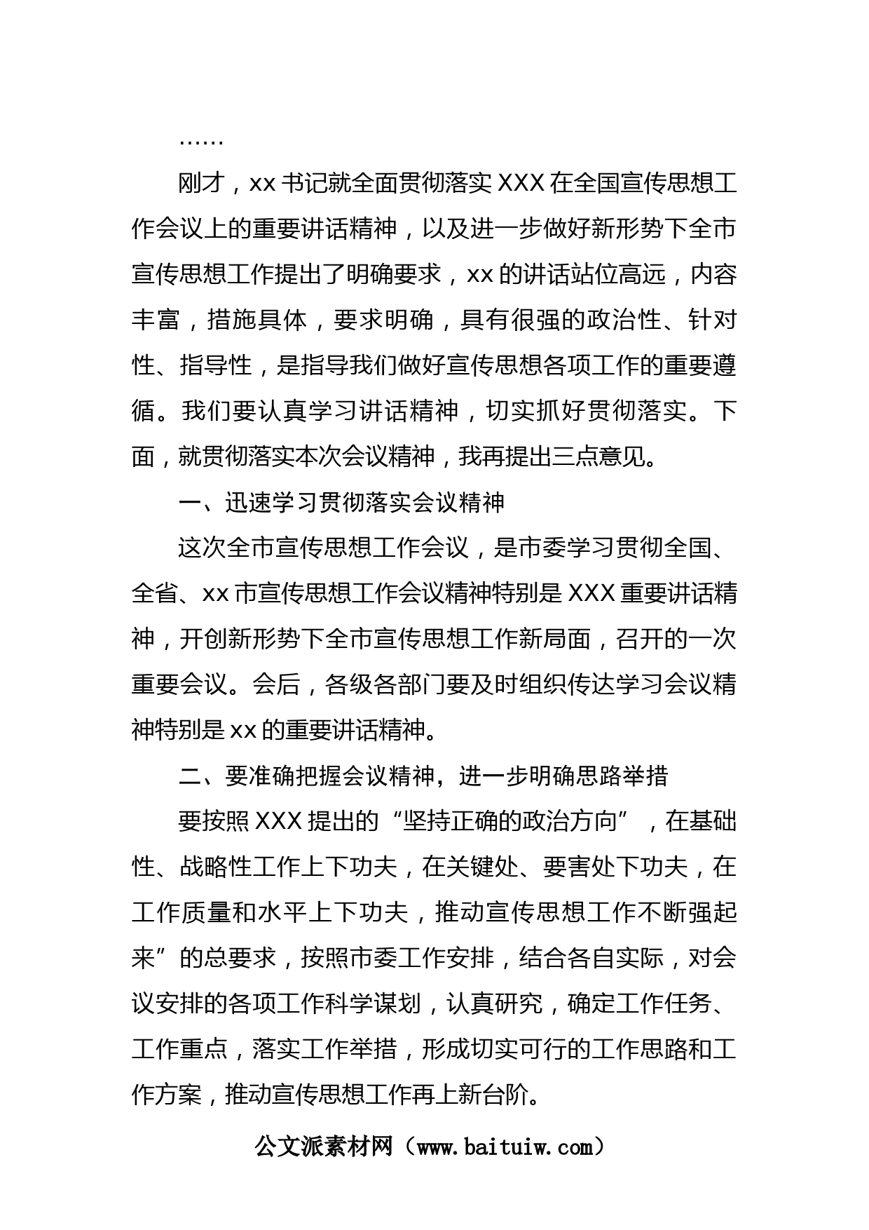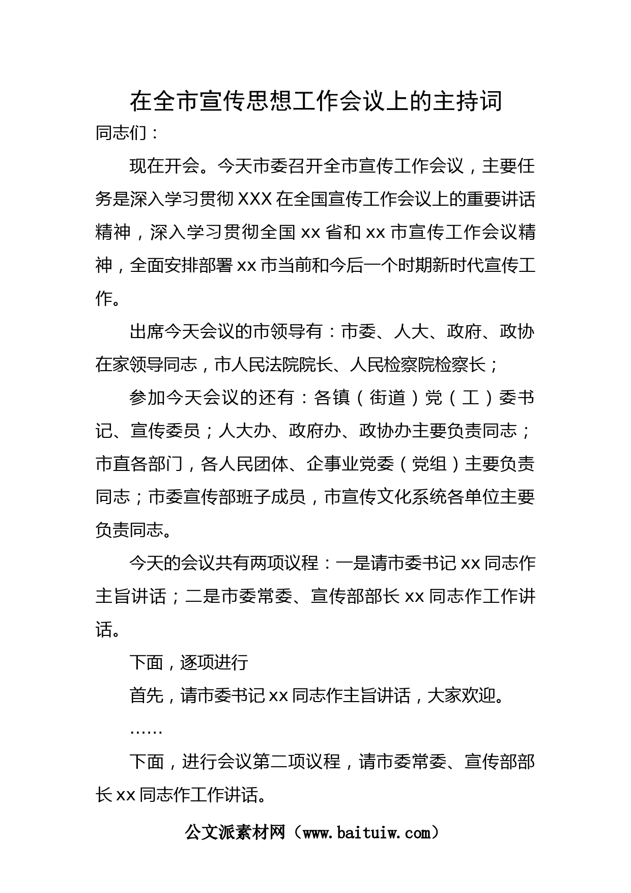 在全市宣傳思想工作會議上的主持詞同志們:現(xiàn)在開會。今天市委召開全市宣傳工作會議,主要任務(wù)是深入學(xué)習(xí)貫徹XXX在全國宣傳工作會議上的重要講話精神,深入學(xué)習(xí)貫徹全國xx省和xx市宣傳工作會議精神,全面安排部署xx市當(dāng)前和今后一個時期新時代宣傳工作。出席今天會議的市領(lǐng)導(dǎo)有:市委、人大、政府、政協(xié)在家領(lǐng)導(dǎo)同志,市人民法院院長、人民檢察院檢察長;參加今天會議的還有:各鎮(zhèn)(街道)黨(工)委書記、宣傳委員;人大辦、政府辦、政協(xié)辦主要負(fù)責(zé)同志;市直各部門,各人民團體、企事業(yè)黨委(黨組)主要負(fù)責(zé)同志;市委宣傳部班子成員,市宣傳文化系統(tǒng)各單位主要負(fù)責(zé)同...
