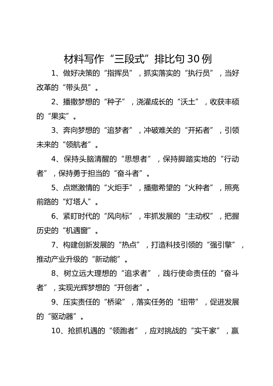 材料寫作“三段式”排比句30例1、做好決策的“指揮員”,抓實(shí)落實(shí)的“執(zhí)行員”,當(dāng)好改革的“帶頭員”。2、播撒夢想的“種子”,澆灌成長的“沃土”,收獲豐碩的“果實(shí)”。3、奔向夢想的“追夢者”,沖破難關(guān)的“開拓者”,引領(lǐng)未來的“領(lǐng)航者”。4、保持頭腦清醒的“思想者”,保持腳踏實(shí)地的“行動(dòng)者”,保持勇于擔(dān)當(dāng)?shù)摹皧^斗者”。5、點(diǎn)燃激情的“火炬手”,播撒希望的“火種者”,照亮前路的“燈塔人”。6、緊盯時(shí)代的“風(fēng)向標(biāo)”,牢抓發(fā)展的“主動(dòng)權(quán)”,把握歷史的“機(jī)遇窗”。7、構(gòu)建創(chuàng)新發(fā)展的“熱點(diǎn)”,打造科技引領(lǐng)的“強(qiáng)引擎”,推動(dòng)產(chǎn)業(yè)升級的“新動(dòng)能”。8、...