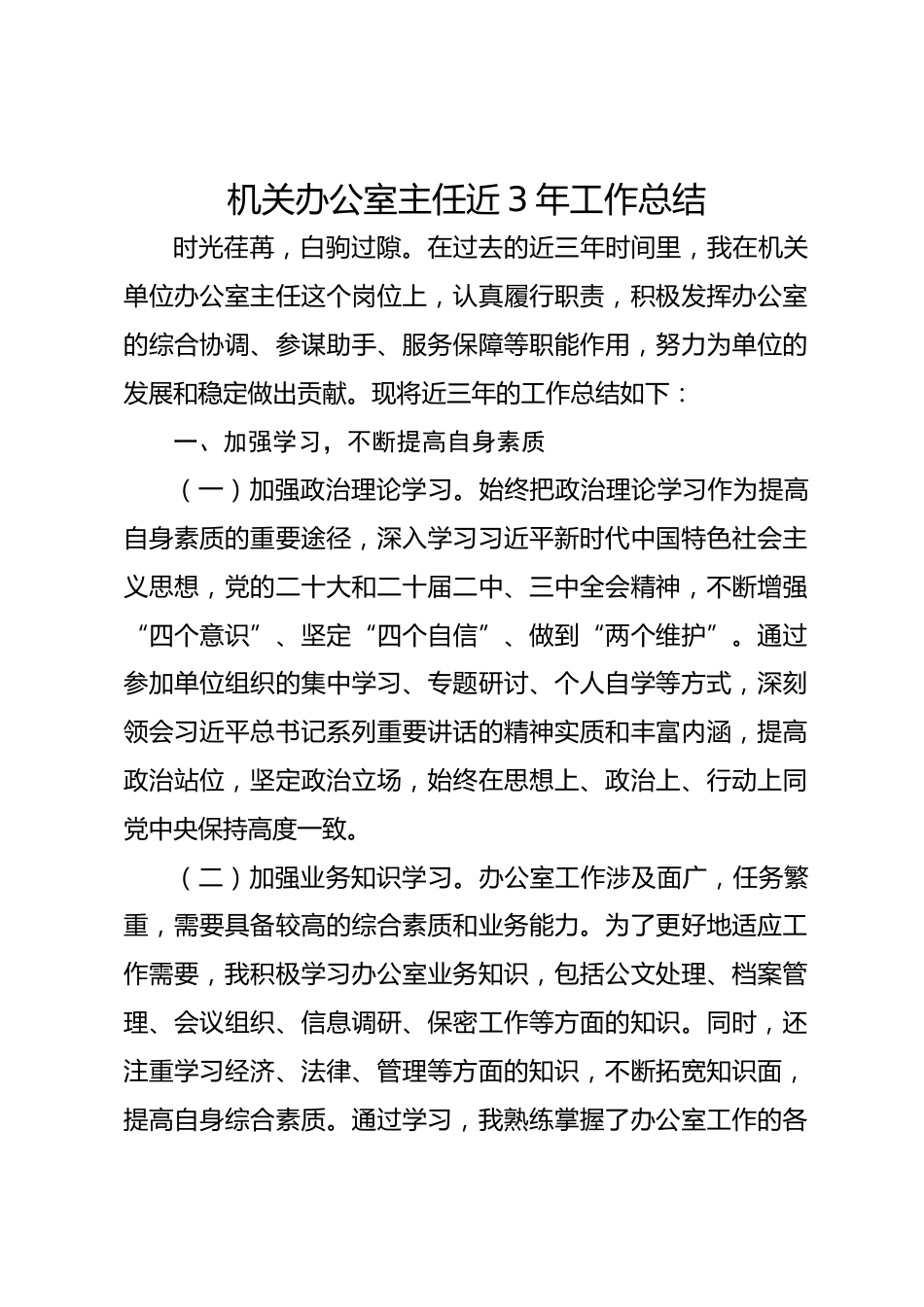 機(jī)關(guān)辦公室主任近3年工作總結(jié)時(shí)光荏苒,白駒過隙。在過去的近三年時(shí)間里,我在機(jī)關(guān)單位辦公室主任這個(gè)崗位上,認(rèn)真履行職責(zé),積極發(fā)揮辦公室的綜合協(xié)調(diào)、參謀助手、服務(wù)保障等職能作用,努力為單位的發(fā)展和穩(wěn)定做出貢獻(xiàn)?,F(xiàn)將近三年的工作總結(jié)如下:一、加強(qiáng)學(xué)習(xí),不斷提高自身素質(zhì)(一)加強(qiáng)政治理論學(xué)習(xí)。始終把政治理論學(xué)習(xí)作為提高自身素質(zhì)的重要途徑,深入學(xué)習(xí)習(xí)近平新時(shí)代中國特色社會(huì)主義思想,黨的二十大和二十屆二中、三中全會(huì)精神,不斷增強(qiáng)“四個(gè)意識”、堅(jiān)定“四個(gè)自信”、做到“兩個(gè)維護(hù)”。通過參加單位組織的集中學(xué)習(xí)、專題研討、個(gè)人自學(xué)等方式,深刻領(lǐng)...