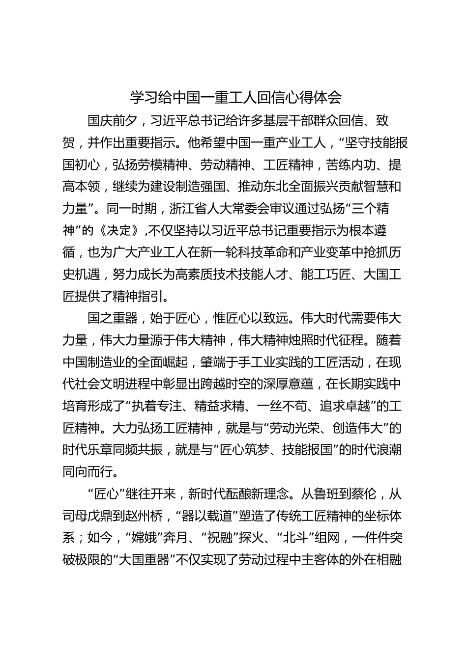 學習給中國一重工人回信心得體會國慶前夕,習近平總書記給許多基層干部群眾回信、致“賀,并作出重要指示。他希望中國一重產(chǎn)業(yè)工人,堅守技能報國初心,弘揚勞模精神、勞動精神、工匠精神,苦練內功、提高本領,繼續(xù)為建設制造強國、推動東北全面振興貢獻智慧和”“力量。同一時期,浙江省人大常委會審議通過弘揚三個精”神的《決定》,不僅堅持以習近平總書記重要指示為根本遵循,也為廣大產(chǎn)業(yè)工人在新一輪科技革命和產(chǎn)業(yè)變革中搶抓歷史機遇,努力成長為高素質技術技能人才、能工巧匠、大國工匠提供了精神指引。國之重器,始于匠心,惟匠心以致遠。偉大時代需要偉大力量...