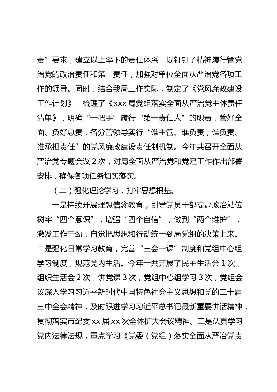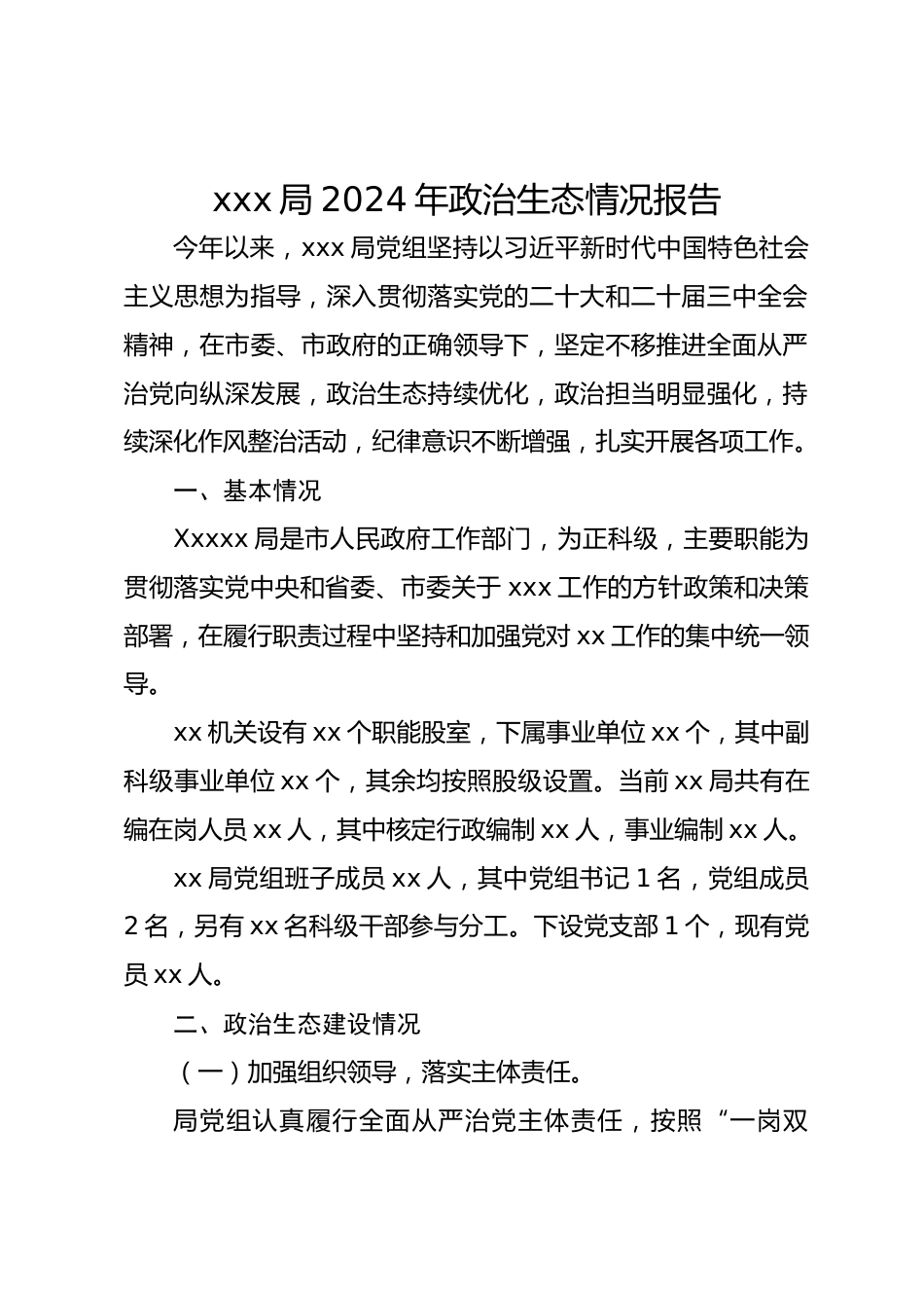 xxx局2024年政治生態(tài)情況報告今年以來,xxx局黨組堅持以習近平新時代中國特色社會主義思想為指導,深入貫徹落實黨的二十大和二十屆三中全會精神,在市委、市政府的正確領導下,堅定不移推進全面從嚴治黨向縱深發(fā)展,政治生態(tài)持續(xù)優(yōu)化,政治擔當明顯強化,持續(xù)深化作風整治活動,紀律意識不斷增強,扎實開展各項工作。一、基本情況Xxxxx局是市人民政府工作部門,為正科級,主要職能為貫徹落實黨中央和省委、市委關于xxx工作的方針政策和決策部署,在履行職責過程中堅持和加強黨對xx工作的集中統(tǒng)一領導。xx機關設有xx個職能股室,下屬事業(yè)單位xx個,其中副科級事業(yè)單位xx個...