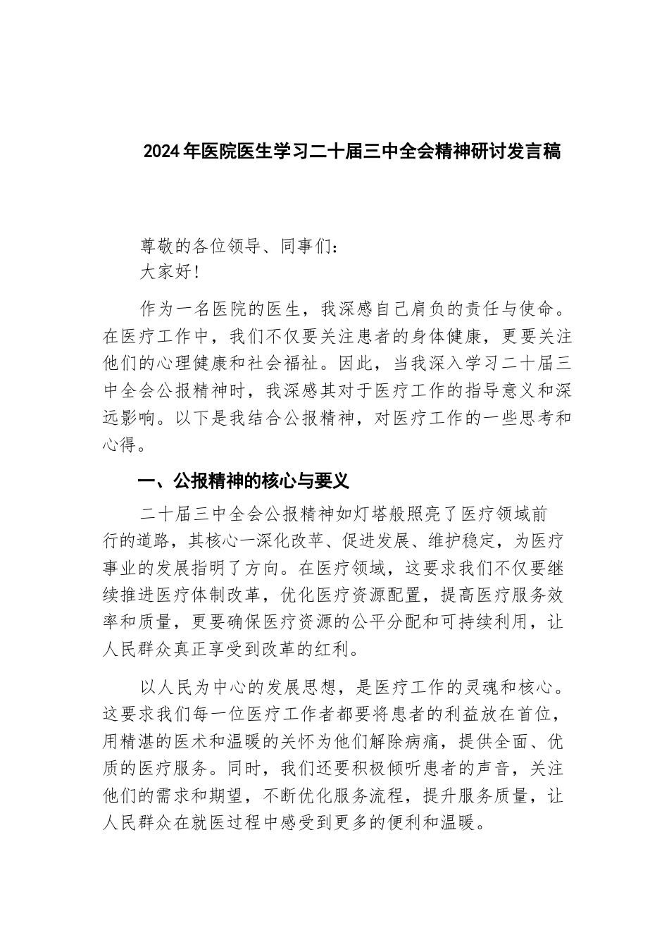 2024年醫(yī)院醫(yī)生學(xué)習(xí)二十屆三中全會精神研討發(fā)言稿5篇(精選版)VIP免費