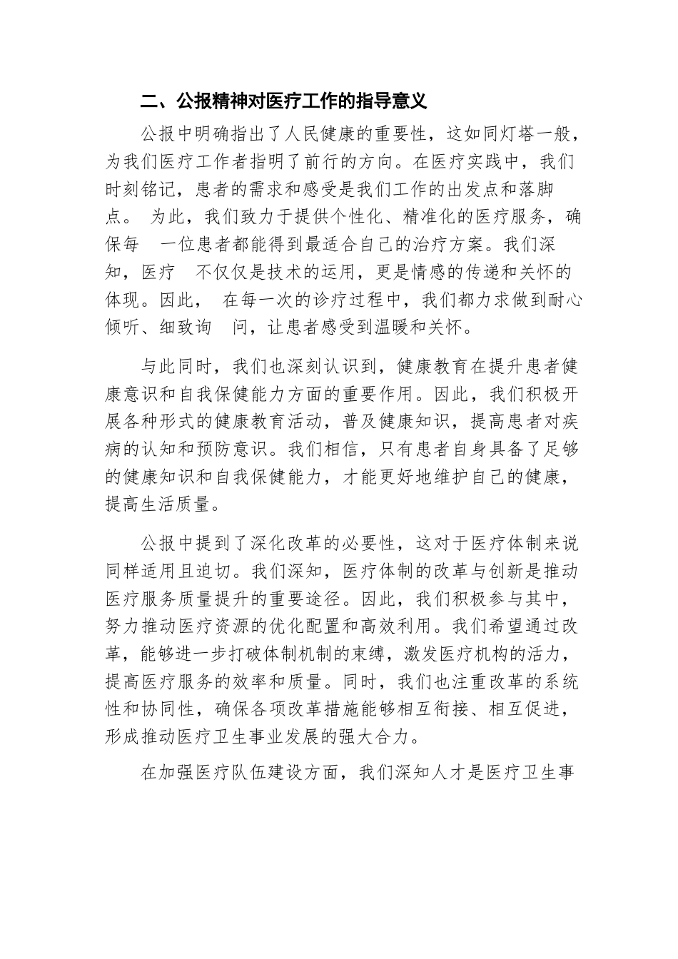 2024年醫(yī)院醫(yī)生學(xué)習(xí)二十屆三中全會精神研討發(fā)言稿尊敬的各位領(lǐng)導(dǎo)、同事們:大家好!作為一名醫(yī)院的醫(yī)生,我深感自己肩負的責(zé)任與使命。在醫(yī)療工作中,我們不僅要關(guān)注患者的身體健康,更要關(guān)注他們的心理健康和社會福祉。因此,當我深入學(xué)習(xí)二十屆三中全會公報精神時,我深感其對于醫(yī)療工作的指導(dǎo)意義和深遠影響。以下是我結(jié)合公報精神,對醫(yī)療工作的一些思考和心得。一、公報精神的核心與要義二十屆三中全會公報精神如燈塔般照亮了醫(yī)療領(lǐng)域前行的道路,其核心一深化改蘋、促進發(fā)展、維護穩(wěn)定,為醫(yī)療事業(yè)的發(fā)展指明了方向。在醫(yī)療領(lǐng)域,這要求我們不僅要繼續(xù)推進醫(yī)療體制...