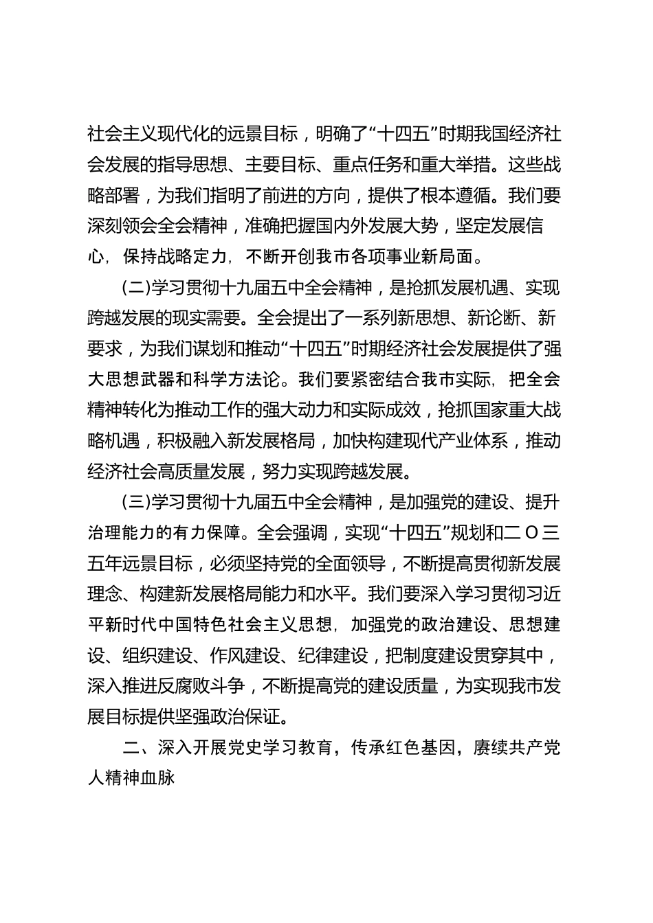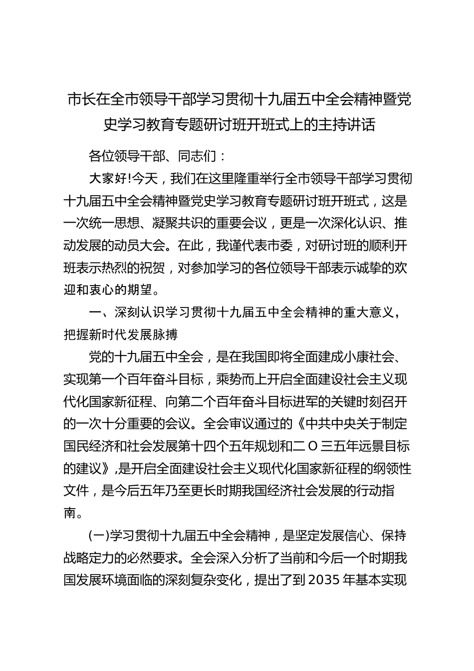 市長在全市領(lǐng)導(dǎo)干部學(xué)習(xí)貫徹十九屆五中全會(huì)精神暨黨史學(xué)習(xí)教育專題研討班開班式上的主持講話各位領(lǐng)導(dǎo)干部、同志們:大家好!今天,我們?cè)谶@里隆重舉行全市領(lǐng)導(dǎo)干部學(xué)習(xí)貫徹十九屆五中全會(huì)精神暨黨史學(xué)習(xí)教育專題研討班開班式,這是一次統(tǒng)一思想、凝聚共識(shí)的重要會(huì)議,更是一次深化認(rèn)識(shí)、推動(dòng)發(fā)展的動(dòng)員大會(huì)。在此,我謹(jǐn)代表市委,對(duì)研討班的順利開班表示熱烈的祝賀,對(duì)參加學(xué)習(xí)的各位領(lǐng)導(dǎo)干部表示誠摯的歡迎和衷心的期望。一、深刻認(rèn)識(shí)學(xué)習(xí)貫徹十九屆五中全會(huì)精神的重大意義,把握新時(shí)代發(fā)展脈搏黨的十九屆五中全會(huì),是在我國即將全面建成小康社會(huì)、實(shí)現(xiàn)第一個(gè)百年奮斗目...