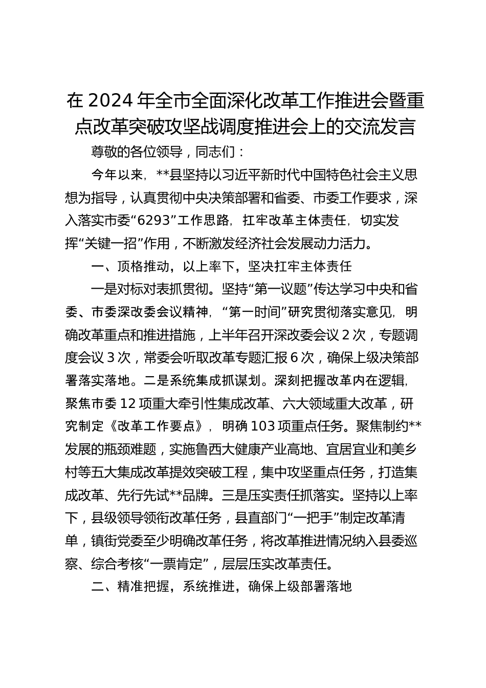 在2024年全市全面深化改革工作推進會暨重點改革突破攻堅戰(zhàn)調(diào)度推進會上的交流發(fā)言尊敬的各位領(lǐng)導(dǎo),同志們:今年以來,**縣堅持以習(xí)近平新時代中國特色社會主義思想為指導(dǎo),認真貫徹中央決策部署和省委、市委工作要求,深“入落實市委6293”工作思路,扛牢改革主體責(zé)任,切實發(fā)“”揮關(guān)鍵一招作用,不斷激發(fā)經(jīng)濟社會發(fā)展動力活力。一、頂格推動,以上率下,堅決扛牢主體責(zé)任“”一是對標對表抓貫徹。堅持第一議題傳達學(xué)習(xí)中央和省“”委、市委深改委會精神,第一研究落意,明議時間貫徹實見確改革重點和推進措施,上半年召開深改委會議2次,專題調(diào)度會議3次,常委會聽取改...