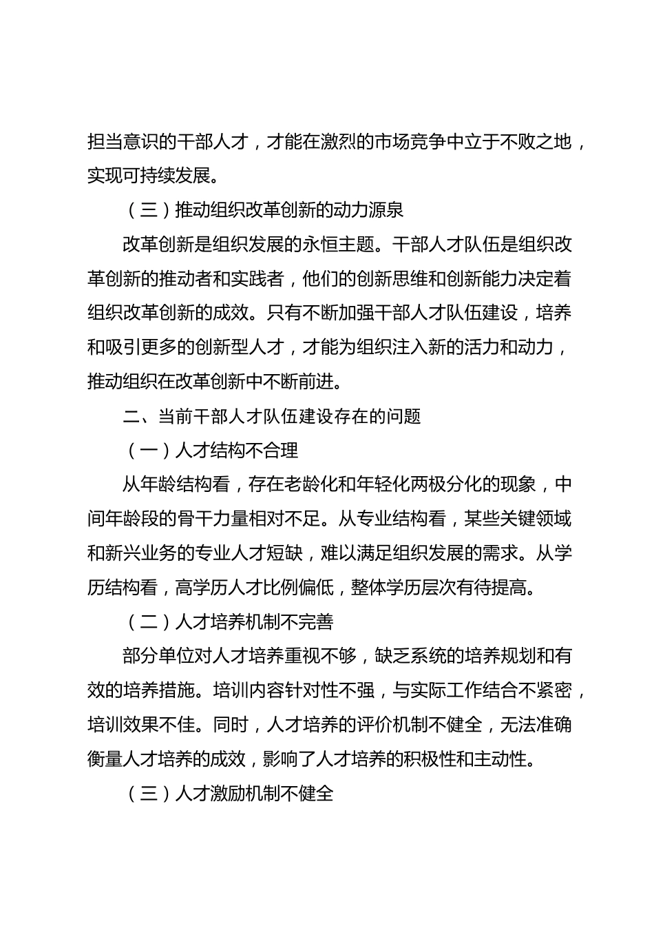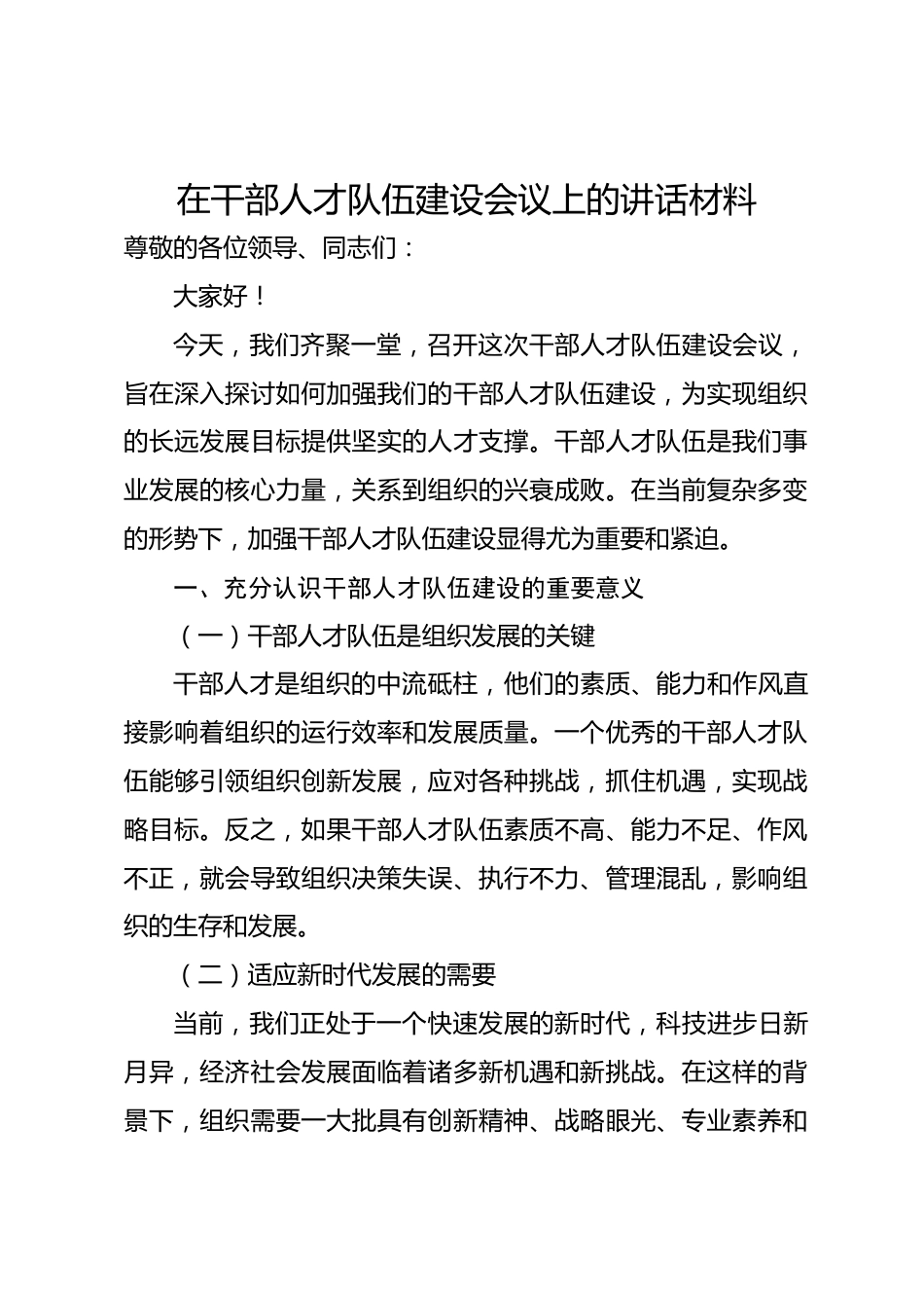 在干部人才隊(duì)伍建設(shè)會(huì)議上的講話材料尊敬的各位領(lǐng)導(dǎo)、同志們:大家好!今天,我們齊聚一堂,召開這次干部人才隊(duì)伍建設(shè)會(huì)議,旨在深入探討如何加強(qiáng)我們的干部人才隊(duì)伍建設(shè),為實(shí)現(xiàn)組織的長(zhǎng)遠(yuǎn)發(fā)展目標(biāo)提供堅(jiān)實(shí)的人才支撐。干部人才隊(duì)伍是我們事業(yè)發(fā)展的核心力量,關(guān)系到組織的興衰成敗。在當(dāng)前復(fù)雜多變的形勢(shì)下,加強(qiáng)干部人才隊(duì)伍建設(shè)顯得尤為重要和緊迫。一、充分認(rèn)識(shí)干部人才隊(duì)伍建設(shè)的重要意義(一)干部人才隊(duì)伍是組織發(fā)展的關(guān)鍵干部人才是組織的中流砥柱,他們的素質(zhì)、能力和作風(fēng)直接影響著組織的運(yùn)行效率和發(fā)展質(zhì)量。一個(gè)優(yōu)秀的干部人才隊(duì)伍能夠引領(lǐng)組織創(chuàng)新發(fā)展,應(yīng)...