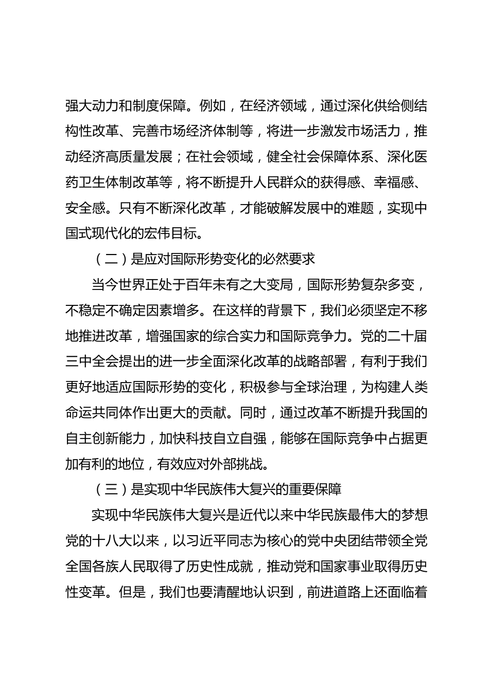 學習貫徹二十屆三中全會精神黨課講稿:《學習貫徹黨的二十屆三中全會精神,奮進新征程》同志們:黨的二十屆三中全會是在以中國式現(xiàn)代化全面推進強國建設、民族復興偉業(yè)的關鍵時期召開的一次十分重要的會議。全會審議通過的《中共中央關于進一步全面深化改革、推進中國式現(xiàn)代化的決定》,是指導新征程上進一步全面深化改革的綱領性文件,對于我們在新時代新征程上不斷奪取新的更大勝利具有重大而深遠的意義。今天,我們在這里深入學習貫徹黨的二十屆三中全會精神,就是要把思想和行動統(tǒng)一到黨中央的決策部署上來,以更加堅定的信心、更加昂揚的斗志、更加務實的作風,為實...