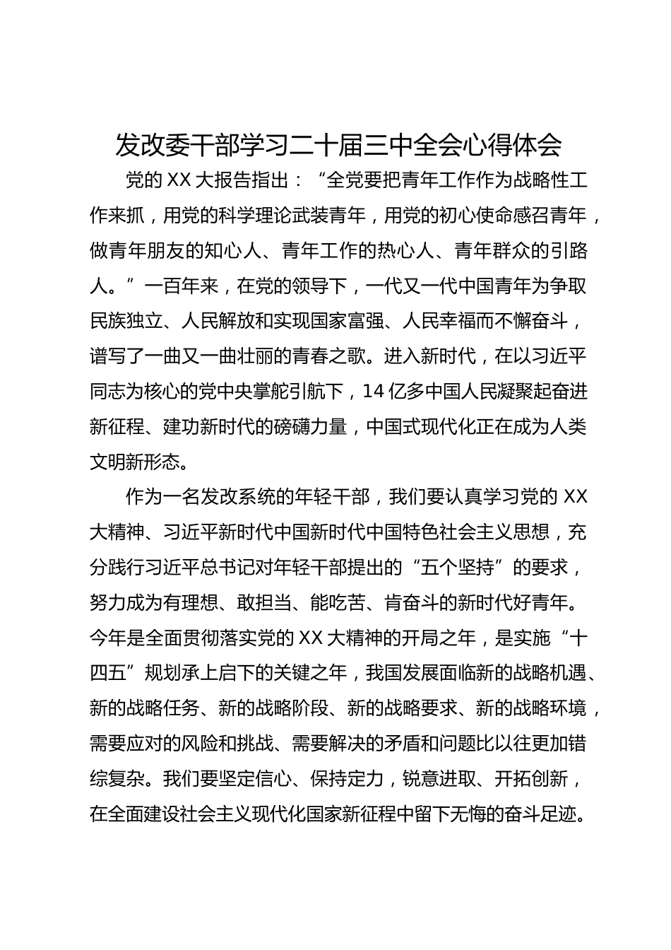 發(fā)改委干部學(xué)習(xí)二十屆三中全會(huì)心得體會(huì)黨的XX大報(bào)告指出:“全黨要把青年工作作為戰(zhàn)略性工作來(lái)抓,用黨的科學(xué)理論武裝青年,用黨的初心使命感召青年,做青年朋友的知心人、青年工作的熱心人、青年群眾的引路人?!币话倌陙?lái),在黨的領(lǐng)導(dǎo)下,一代又一代中國(guó)青年為爭(zhēng)取民族獨(dú)立、人民解放和實(shí)現(xiàn)國(guó)家富強(qiáng)、人民幸福而不懈奮斗,譜寫了一曲又一曲壯麗的青春之歌。進(jìn)入新時(shí)代,在以習(xí)近平同志為核心的黨中央掌舵引航下,14億多中國(guó)人民凝聚起奮進(jìn)新征程、建功新時(shí)代的磅礴力量,中國(guó)式現(xiàn)代化正在成為人類文明新形態(tài)。作為一名發(fā)改系統(tǒng)的年輕干部,我們要認(rèn)真學(xué)習(xí)黨的XX大精神、...