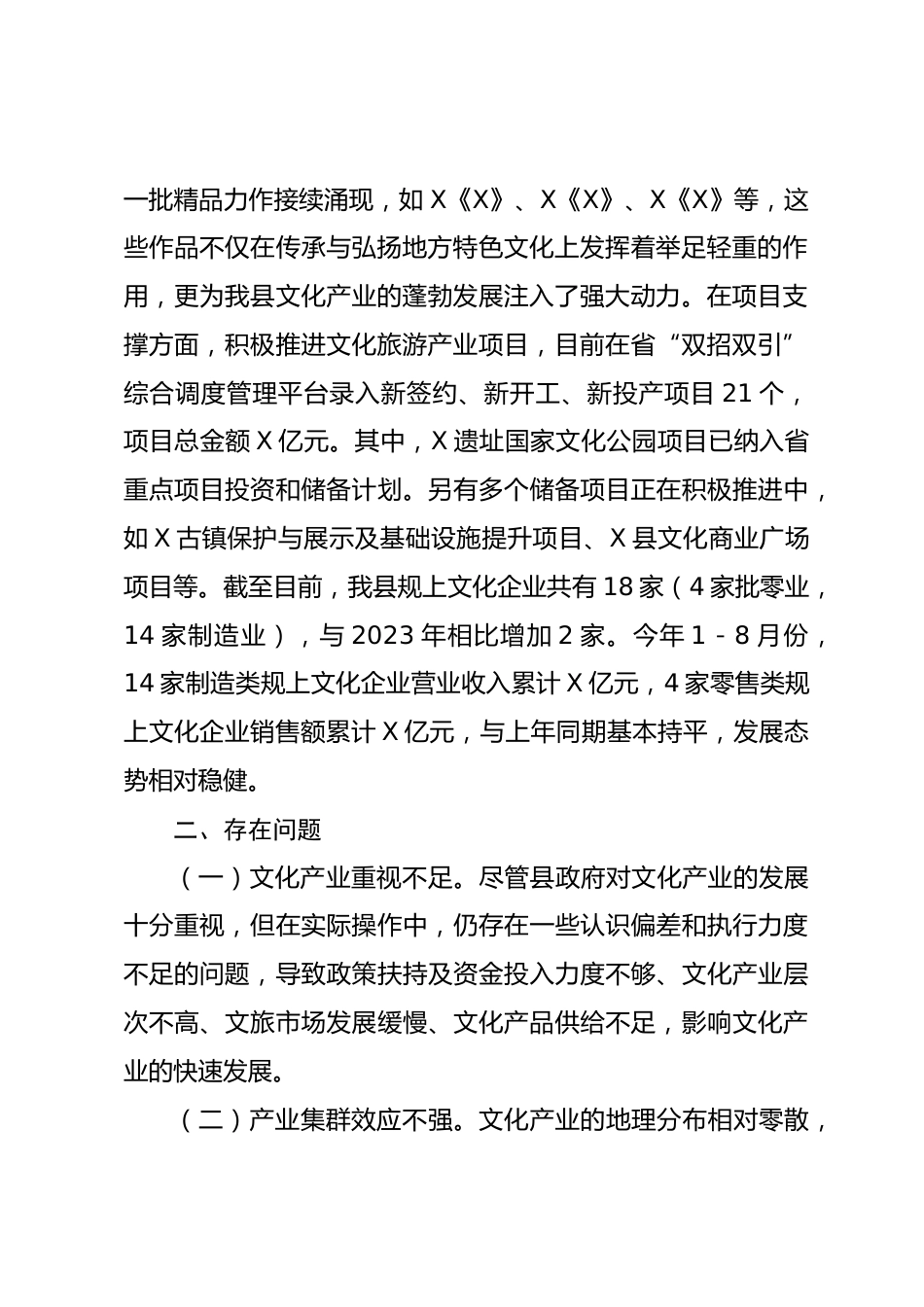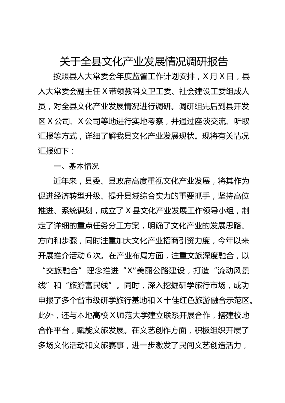 關(guān)于全縣文化產(chǎn)業(yè)發(fā)展情況調(diào)研報告按照縣人大常委會年度監(jiān)督工作計劃安排,X月X日,縣人大常委會副主任X帶領(lǐng)教科文衛(wèi)工委、社會建設(shè)工委組成人員,對全縣文化產(chǎn)業(yè)發(fā)展情況進行調(diào)研。調(diào)研組先后到縣開發(fā)區(qū)X公司、X公司等地進行實地考察,并通過座談交流、聽取匯報等方式,詳細了解我縣文化產(chǎn)業(yè)發(fā)展現(xiàn)狀?,F(xiàn)將有關(guān)情況匯報如下:一、基本情況近年來,縣委、縣政府高度重視文化產(chǎn)業(yè)發(fā)展,將其作為促進經(jīng)濟轉(zhuǎn)型升級、提升縣域綜合實力的重要抓手,堅持高位推進、系統(tǒng)謀劃,成立了X縣文化產(chǎn)業(yè)發(fā)展工作領(lǐng)導(dǎo)小組,制定了詳細的重點任務(wù)分工方案,明確了文化產(chǎn)業(yè)的發(fā)展思路、方向...