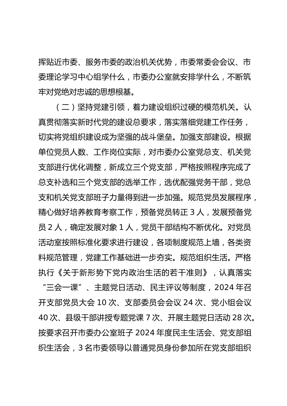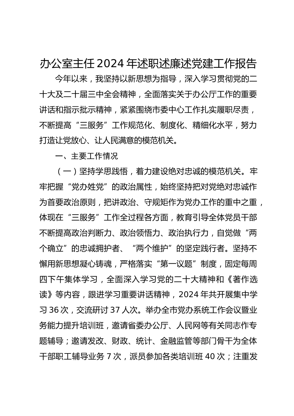 辦公室主任2024年述職述廉述黨建工作報(bào)告今年以來,我堅(jiān)持以新思想為指導(dǎo),深入學(xué)習(xí)貫徹黨的二十大及二十屆三中全會(huì)精神,全面落實(shí)關(guān)于辦公廳工作的重要講話和指示批示精神,緊緊圍繞市委中心工作扎實(shí)履職盡責(zé),不斷提高“三服務(wù)”工作規(guī)范化、制度化、精細(xì)化水平,努力打造讓黨放心、讓人民滿意的模范機(jī)關(guān)。一、主要工作情況(一)堅(jiān)持學(xué)思踐悟,著力建設(shè)絕對(duì)忠誠(chéng)的模范機(jī)關(guān)。牢牢把握“黨辦姓黨”的政治屬性,始終堅(jiān)持把對(duì)黨絕對(duì)忠誠(chéng)作為首要政治原則,把講政治、守規(guī)矩作為黨辦工作的重中之重,體現(xiàn)在“三服務(wù)”工作全過程各方面,教育引導(dǎo)全體黨員干部不斷提高政治判...