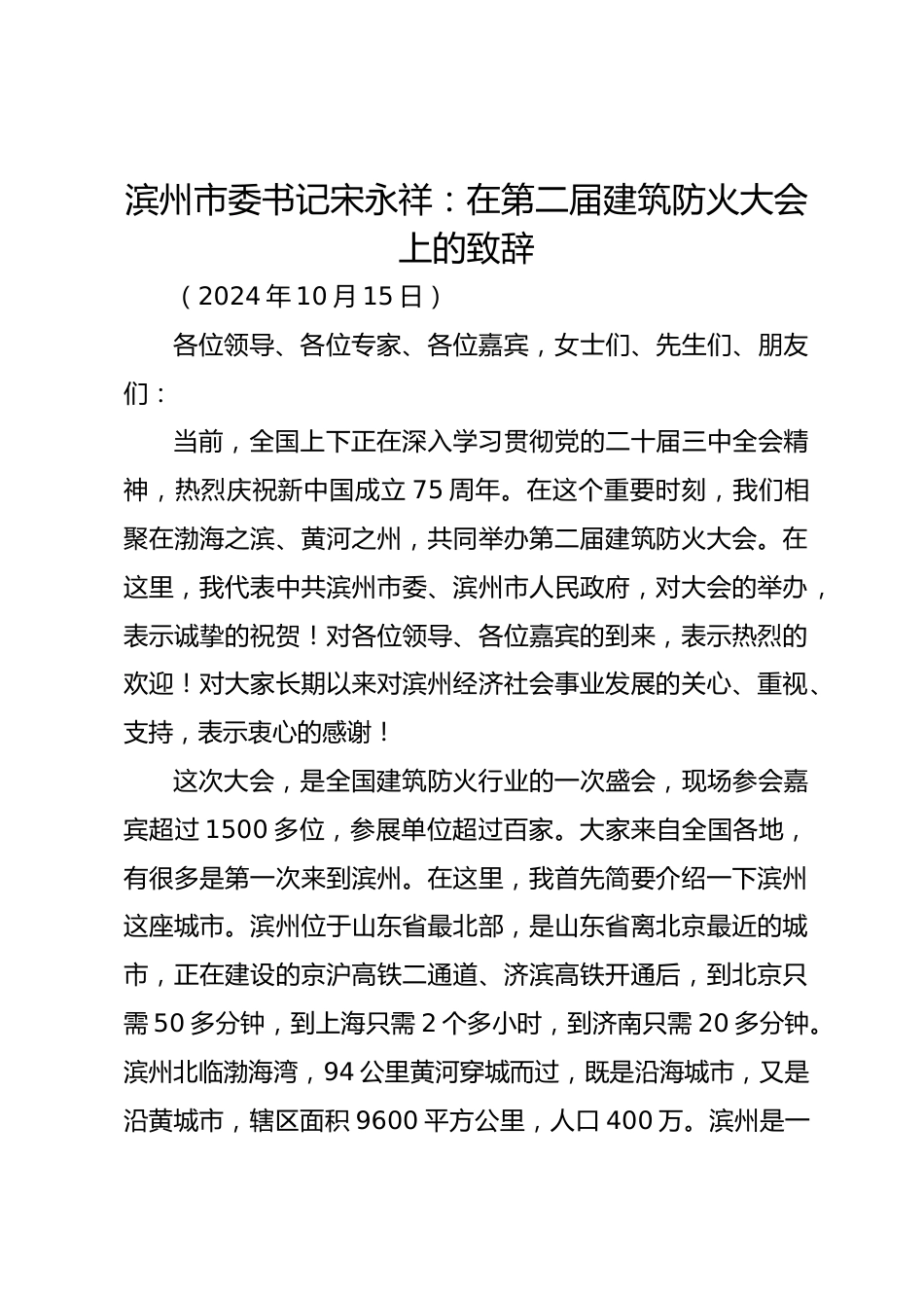 濱州市委書記宋永祥:在第二屆建筑防火大會(huì)上的致辭(2024年10月15日)各位領(lǐng)導(dǎo)、各位專家、各位嘉賓,女士們、先生們、朋友們:當(dāng)前,全國上下正在深入學(xué)習(xí)貫徹黨的二十屆三中全會(huì)精神,熱烈慶祝新中國成立75周年。在這個(gè)重要時(shí)刻,我們相聚在渤海之濱、黃河之州,共同舉辦第二屆建筑防火大會(huì)。在這里,我代表中共濱州市委、濱州市人民政府,對(duì)大會(huì)的舉辦,表示誠摯的祝賀!對(duì)各位領(lǐng)導(dǎo)、各位嘉賓的到來,表示熱烈的歡迎!對(duì)大家長期以來對(duì)濱州經(jīng)濟(jì)社會(huì)事業(yè)發(fā)展的關(guān)心、重視、支持,表示衷心的感謝!這次大會(huì),是全國建筑防火行業(yè)的一次盛會(huì),現(xiàn)場參會(huì)嘉賓超過1500多位,...