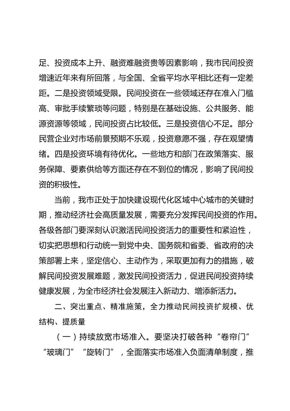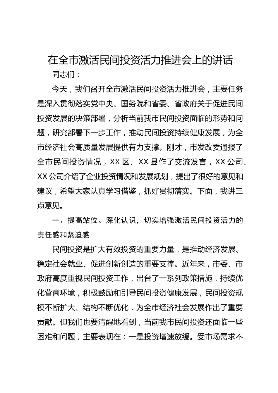 在全市激活民間投資活力推進(jìn)會上的講話同志們:今天,我們召開全市激活民間投資活力推進(jìn)會,主要任務(wù)是深入貫徹落實黨中央、國務(wù)院和省委、省政府關(guān)于促進(jìn)民間投資發(fā)展的決策部署,分析當(dāng)前我市民間投資面臨的形勢和問題,研究部署下一步工作,推動民間投資持續(xù)健康發(fā)展,為全市經(jīng)濟(jì)社會高質(zhì)量發(fā)展提供有力支撐。剛才,市發(fā)改委通報了全市民間投資情況,XX區(qū)、XX縣作了交流發(fā)言,XX公司、XX公司介紹了企業(yè)投資情況和發(fā)展規(guī)劃,提出了很好的意見和建議,希望大家認(rèn)真學(xué)習(xí)借鑒,抓好貫徹落實。下面,我講三點意見。一、提高站位、深化認(rèn)識,切實增強(qiáng)激活民間投資活力的責(zé)任...