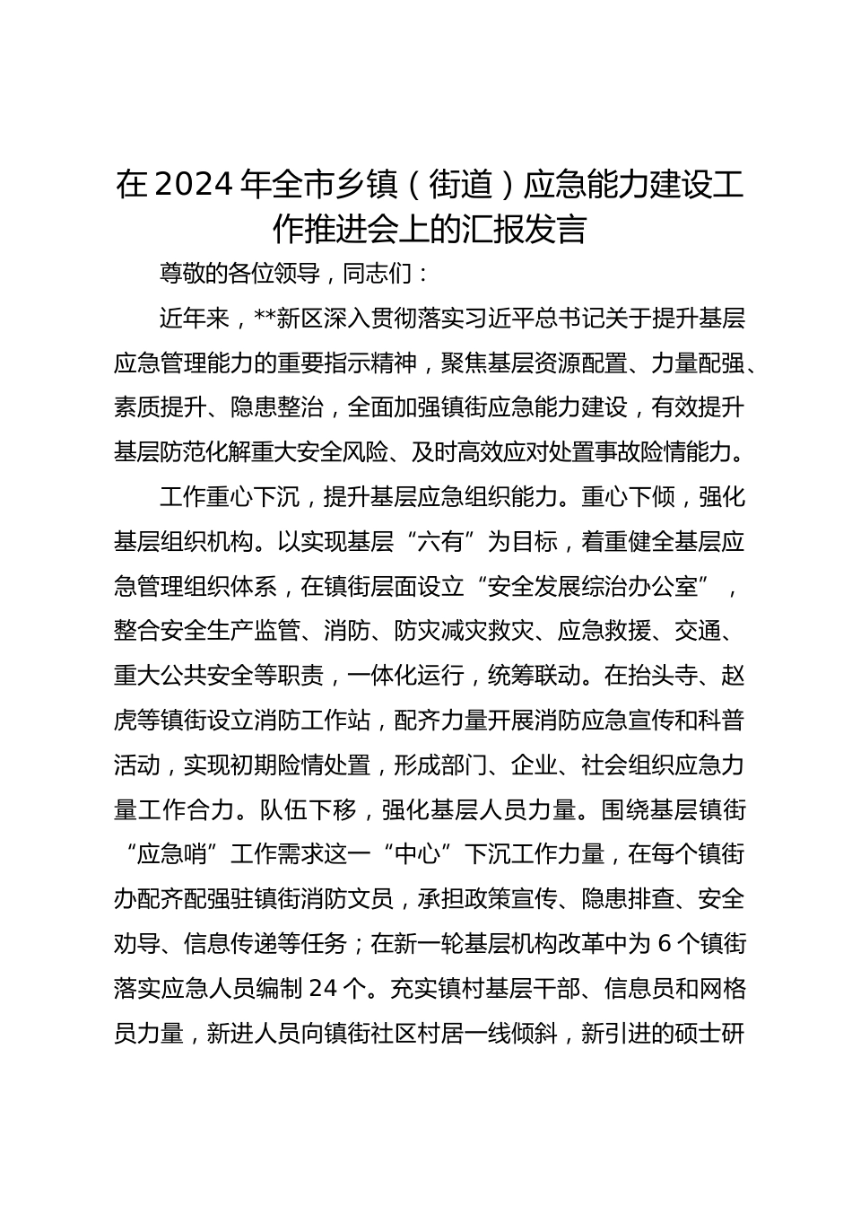 在2024年全市鄉(xiāng)鎮(zhèn)(街道)應(yīng)急能力建設(shè)工作推進會上的匯報發(fā)言尊敬的各位領(lǐng)導(dǎo),同志們:近年來,**新區(qū)深入貫徹落實習(xí)近平總書記關(guān)于提升基層應(yīng)急管理能力的重要指示精神,聚焦基層資源配置、力量配強、素質(zhì)提升、隱患整治,全面加強鎮(zhèn)街應(yīng)急能力建設(shè),有效提升基層防范化解重大安全風(fēng)險、及時高效應(yīng)對處置事故險情能力。工作重心下沉,提升基層應(yīng)急組織能力。重心下傾,強化基層組織機構(gòu)。以實現(xiàn)基層“六有”為目標(biāo),著重健全基層應(yīng)急管理組織體系,在鎮(zhèn)街層面設(shè)立“安全發(fā)展綜治辦公室”,整合安全生產(chǎn)監(jiān)管、消防、防災(zāi)減災(zāi)救災(zāi)、應(yīng)急救援、交通、重大公共安全等職責(zé),...