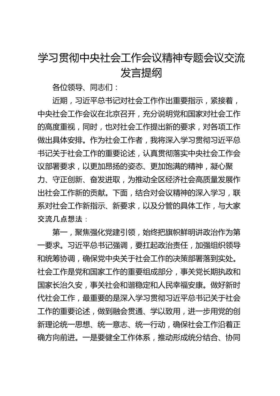 學(xué)習(xí)貫徹中央社會(huì)工作會(huì)議精神專題會(huì)議交流發(fā)言提綱VIP免費(fèi)