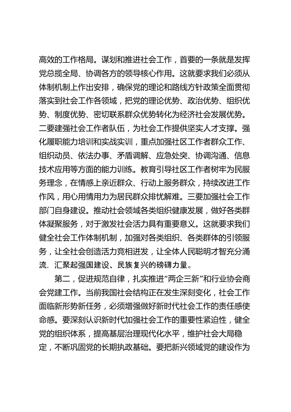 學(xué)習(xí)貫徹中央社會(huì)工作會(huì)議精神專題會(huì)議交流發(fā)言提綱各位領(lǐng)導(dǎo)、同志們:近期,習(xí)近平總書記對社會(huì)工作作出重要指示,緊接著,中央社會(huì)工作會(huì)議在北京召開,充分說明黨和國家對社會(huì)工作的高度重視,同時(shí),也對社會(huì)工作提出新的要求,對各項(xiàng)工作做出具體安排。作為社會(huì)工作者,我將深入學(xué)習(xí)貫徹習(xí)近平總書記關(guān)于社會(huì)工作的重要論述,認(rèn)真貫徹落實(shí)中央社會(huì)工作會(huì)議部署要求,以更加昂揚(yáng)的姿態(tài)、更加飽滿的精神,凝心聚力、守正創(chuàng)新、奮發(fā)進(jìn)取,為推動(dòng)全區(qū)經(jīng)濟(jì)社會(huì)高質(zhì)量發(fā)展作出社會(huì)工作新的貢獻(xiàn)。下面,結(jié)合對會(huì)議精神的深入學(xué)習(xí),聯(lián)系對社會(huì)工作新指示、新要求,以及分管的...