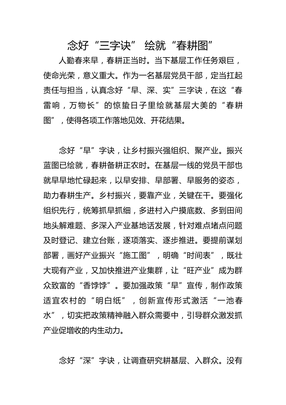 念好“三字訣”繪就“春耕圖”人勤春來早,春耕正當時。當下基層工作任務艱巨,使命光榮,意義重大。作為一名基層黨員干部,定當扛起責任與擔當,認真念好“早、深、實”三字訣,在這“春雷響,萬物長”的驚蟄日子里繪就基層大美的“春耕圖”,使得各項工作落地見效、開花結果。念好“早”字訣,讓鄉(xiāng)村振興強組織、聚產(chǎn)業(yè)。振興藍圖已繪就,春耕備耕正農(nóng)時。在基層一線的黨員干部也就早早地忙碌起來,以早安排、早部署、早服務的姿態(tài),助力春耕生產(chǎn)。鄉(xiāng)村振興,要靠產(chǎn)業(yè),關鍵在干。要強化組織先行,統(tǒng)籌抓早抓細,多進村入戶摸底數(shù)、多到田間地頭解難題、多深入產(chǎn)業(yè)基地...