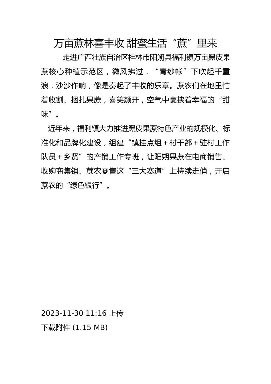 萬(wàn)畝蔗林喜豐收甜蜜生活“蔗”里來(lái)走進(jìn)廣西壯族自治區(qū)桂林市陽(yáng)朔縣福利鎮(zhèn)萬(wàn)畝黑皮果蔗核心種植示范區(qū),微風(fēng)拂過(guò),“青紗帳”下吹起千重浪,沙沙作響,像是奏起了豐收的樂(lè)章。蔗農(nóng)們?cè)诘乩锩χ崭?、捆扎果蔗,喜笑顏開(kāi),空氣中裹挾著幸福的“甜味”。近年來(lái),福利鎮(zhèn)大力推進(jìn)黑皮果蔗特色產(chǎn)業(yè)的規(guī)?;?、標(biāo)準(zhǔn)化和品牌化建設(shè),組建“鎮(zhèn)掛點(diǎn)組+村干部+駐村工作隊(duì)員+鄉(xiāng)賢”的產(chǎn)銷工作專班,讓陽(yáng)朔果蔗在電商銷售、收購(gòu)商集銷、蔗農(nóng)零售這“三大賽道”上持續(xù)走俏,開(kāi)啟蔗農(nóng)的“綠色銀行”。2023-11-3011:16上傳下載附件(1.15MB)2023-11-3011:16上傳下載附件(1.15MB)2023-11-...
