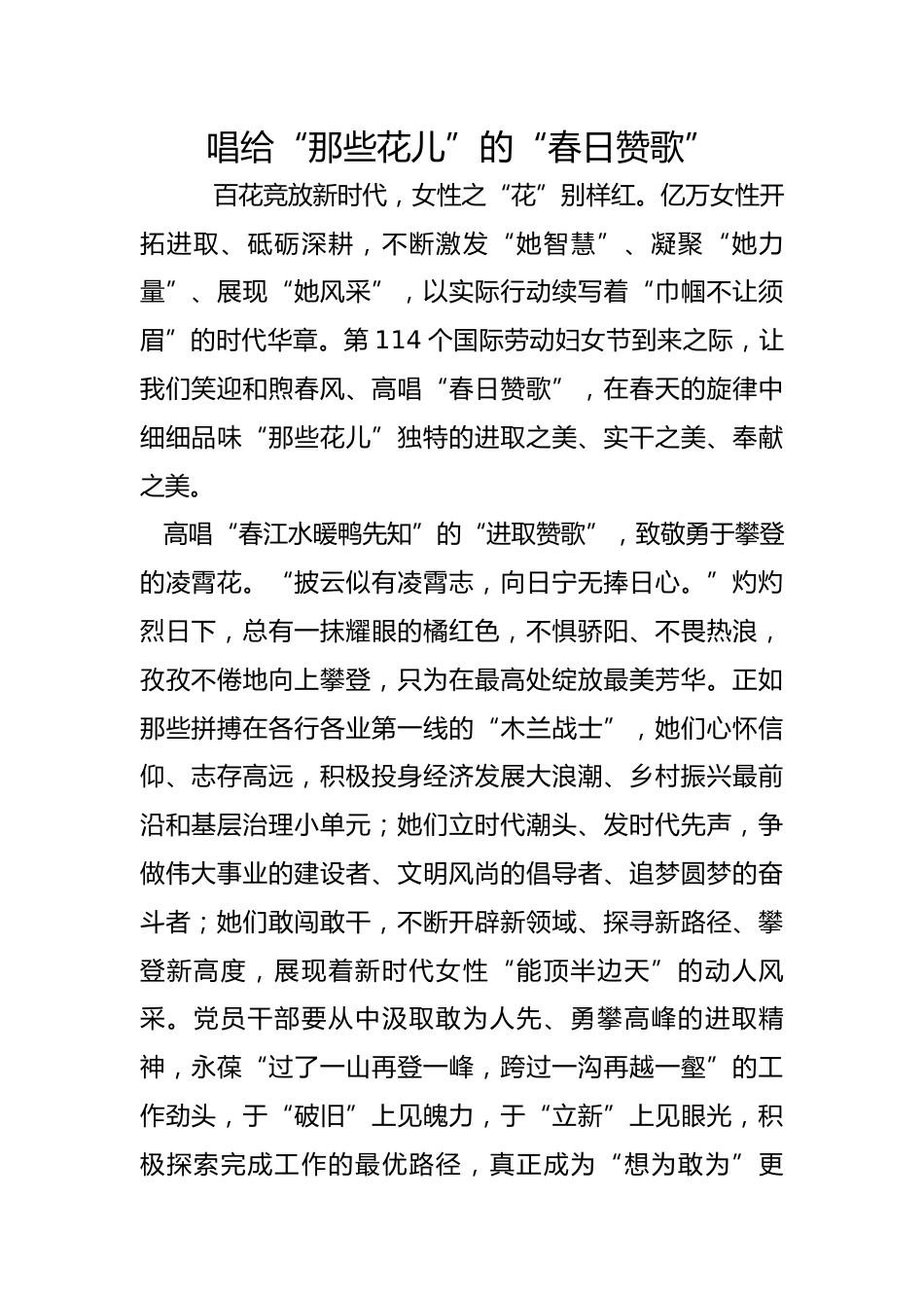 唱給“那些花兒”的“春日贊歌”百花競放新時代,女性之“花”別樣紅。億萬女性開拓進取、砥礪深耕,不斷激發(fā)“她智慧”、凝聚“她力量”、展現(xiàn)“她風(fēng)采”,以實際行動續(xù)寫著“巾幗不讓須眉”的時代華章。第114個國際勞動婦女節(jié)到來之際,讓我們笑迎和煦春風(fēng)、高唱“春日贊歌”,在春天的旋律中細細品味“那些花兒”獨特的進取之美、實干之美、奉獻之美。高唱“春江水暖鴨先知”的“進取贊歌”,致敬勇于攀登的凌霄花?!芭扑朴辛柘鲋?,向日寧無捧日心?!弊谱屏胰障?,總有一抹耀眼的橘紅色,不懼驕陽、不畏熱浪,孜孜不倦地向上攀登,只為在最高處綻放最美芳華。正如...