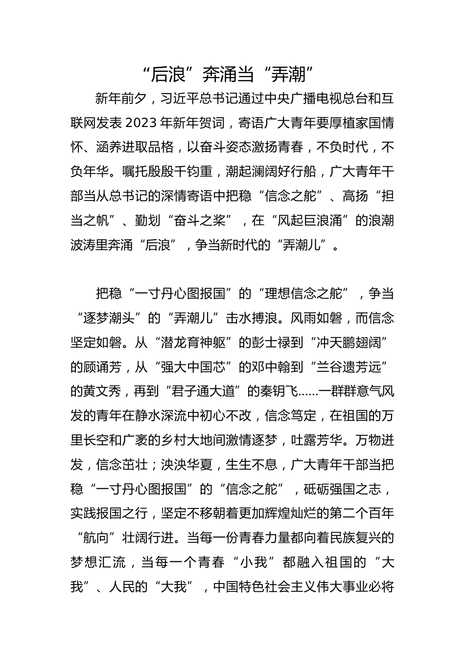 “后浪”奔涌當(dāng)“弄潮”新年前夕,習(xí)近平總書記通過中央廣播電視總臺(tái)和互聯(lián)網(wǎng)發(fā)表2023年新年賀詞,寄語廣大青年要厚植家國(guó)情懷、涵養(yǎng)進(jìn)取品格,以奮斗姿態(tài)激揚(yáng)青春,不負(fù)時(shí)代,不負(fù)年華。囑托殷殷千鈞重,潮起瀾闊好行船,廣大青年干部當(dāng)從總書記的深情寄語中把穩(wěn)“信念之舵”、高揚(yáng)“擔(dān)當(dāng)之帆”、勤劃“奮斗之槳”,在“風(fēng)起巨浪涌”的浪潮波濤里奔涌“后浪”,爭(zhēng)當(dāng)新時(shí)代的“弄潮兒”。把穩(wěn)“一寸丹心圖報(bào)國(guó)”的“理想信念之舵”,爭(zhēng)當(dāng)“逐夢(mèng)潮頭”的“弄潮兒”擊水搏浪。風(fēng)雨如磐,而信念堅(jiān)定如磐。從“潛龍育神軀”的彭士祿到“沖天鵬翅闊”的顧誦芳,從“強(qiáng)大中國(guó)芯...