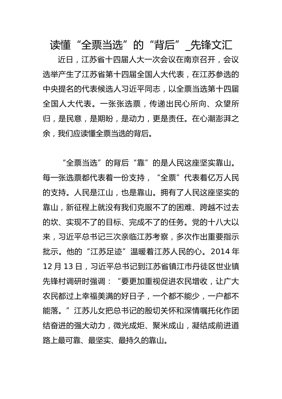 讀懂“全票當(dāng)選”的“背后”_先鋒文匯近日,江蘇省十四屆人大一次會議在南京召開,會議選舉產(chǎn)生了江蘇省第十四屆全國人大代表,在江蘇參選的中央提名的代表候選人習(xí)近平同志,以全票當(dāng)選第十四屆全國人大代表。一張張選票,傳遞出民心所向、眾望所歸,是民意,是期盼,是動力,更是責(zé)任。在心潮澎湃之余,我們應(yīng)讀懂全票當(dāng)選的背后?!叭碑?dāng)選”的背后“靠”的是人民這座堅實靠山。每一張選票都代表著一份支持,“全票”代表著億萬人民的支持。人民是江山,也是靠山。擁有了人民這座堅實的靠山,新征程上就沒有我們克服不了的困難、跨越不過去的坎、實現(xiàn)不了的目標(biāo)、完...