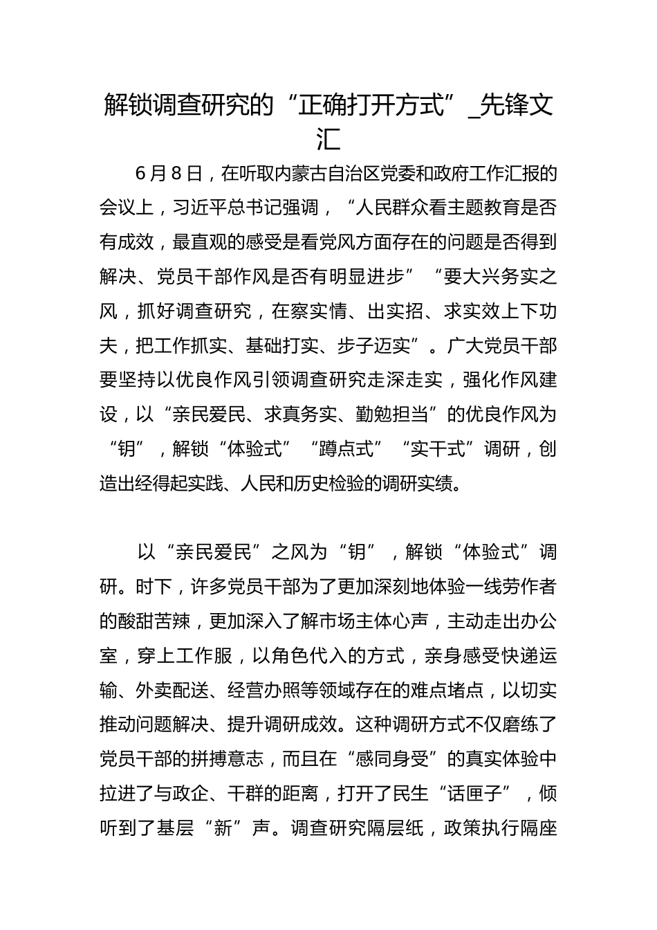 解鎖調查研究的“正確打開方式”_先鋒文匯6月8日,在聽取內蒙古自治區(qū)黨委和政府工作匯報的會議上,習近平總書記強調,“人民群眾看主題教育是否有成效,最直觀的感受是看黨風方面存在的問題是否得到解決、黨員干部作風是否有明顯進步”“要大興務實之風,抓好調查研究,在察實情、出實招、求實效上下功夫,把工作抓實、基礎打實、步子邁實”。廣大黨員干部要堅持以優(yōu)良作風引領調查研究走深走實,強化作風建設,以“親民愛民、求真務實、勤勉擔當”的優(yōu)良作風為“鑰”,解鎖“體驗式”“蹲點式”“實干式”調研,創(chuàng)造出經(jīng)得起實踐、人民和歷史檢驗的調研實績。以“親民...