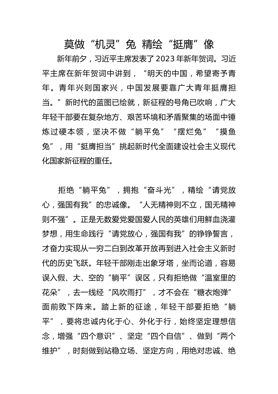 莫做“機(jī)靈”兔精繪“挺膺”像新年前夕,習(xí)近平主席發(fā)表了2023年新年賀詞。習(xí)近平主席在新年賀詞中講到,“明天的中國(guó),希望寄予青年。青年興則國(guó)家興,中國(guó)發(fā)展要靠廣大青年挺膺擔(dān)當(dāng)。”新時(shí)代的藍(lán)圖已繪就,新征程的號(hào)角已吹響,廣大年輕干部要在復(fù)雜地方、艱苦環(huán)境和矛盾聚集的場(chǎng)面中錘煉過硬本領(lǐng),堅(jiān)決不做“躺平兔”“擺爛兔”“摸魚兔”,用“挺膺擔(dān)當(dāng)”挑起新時(shí)代全面建設(shè)社會(huì)主義現(xiàn)代化國(guó)家新征程的重任。拒絕“躺平兔”,擁抱“奮斗光”,精繪“請(qǐng)黨放心,強(qiáng)國(guó)有我”的忠誠(chéng)像?!叭藷o(wú)精神則不立,國(guó)無(wú)精神則不強(qiáng)”。正是無(wú)數(shù)愛黨愛國(guó)愛人民的英雄們用鮮血澆灌夢(mèng)...