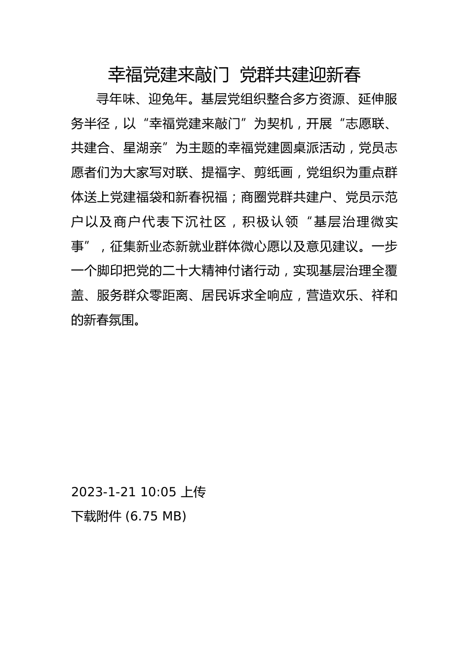 幸福黨建來敲門黨群共建迎新春尋年味、迎兔年?;鶎狱h組織整合多方資源、延伸服務(wù)半徑,以“幸福黨建來敲門”為契機(jī),開展“志愿聯(lián)、共建合、星湖親”為主題的幸福黨建圓桌派活動,黨員志愿者們?yōu)榇蠹覍憣β?lián)、提福字、剪紙畫,黨組織為重點(diǎn)群體送上黨建福袋和新春祝福;商圈黨群共建戶、黨員示范戶以及商戶代表下沉社區(qū),積極認(rèn)領(lǐng)“基層治理微實(shí)事”,征集新業(yè)態(tài)新就業(yè)群體微心愿以及意見建議。一步一個(gè)腳印把黨的二十大精神付諸行動,實(shí)現(xiàn)基層治理全覆蓋、服務(wù)群眾零距離、居民訴求全響應(yīng),營造歡樂、祥和的新春氛圍。2023-1-2110:05上傳下載附件(6.75MB)2023-1-2110:08...