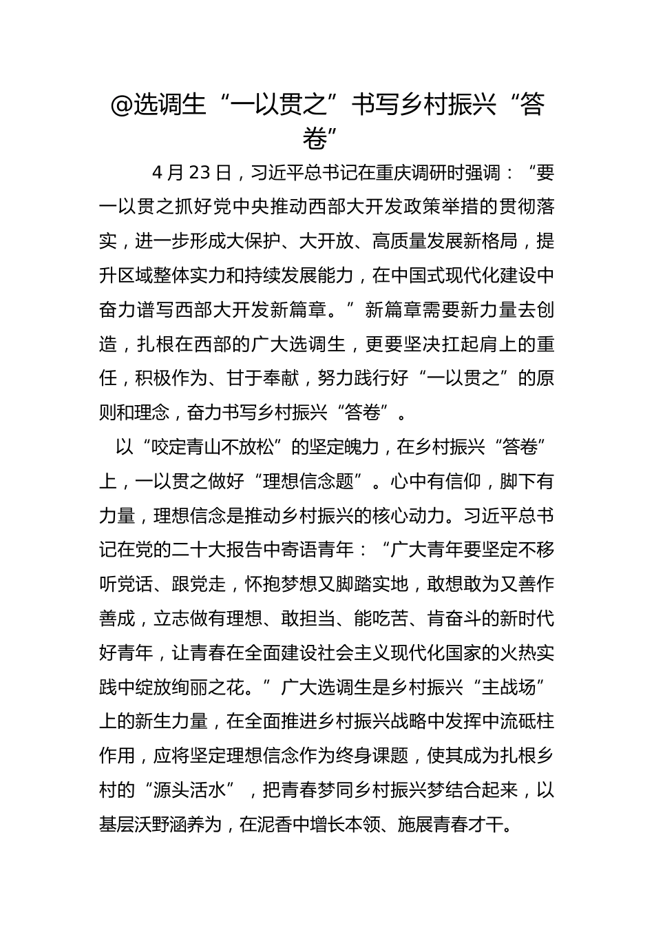 @選調(diào)生“一以貫之”書寫鄉(xiāng)村振興“答卷”4月23日,習(xí)近平總書記在重慶調(diào)研時強調(diào):“要一以貫之抓好黨中央推動西部大開發(fā)政策舉措的貫徹落實,進(jìn)一步形成大保護(hù)、大開放、高質(zhì)量發(fā)展新格局,提升區(qū)域整體實力和持續(xù)發(fā)展能力,在中國式現(xiàn)代化建設(shè)中奮力譜寫西部大開發(fā)新篇章。”新篇章需要新力量去創(chuàng)造,扎根在西部的廣大選調(diào)生,更要堅決扛起肩上的重任,積極作為、甘于奉獻(xiàn),努力踐行好“一以貫之”的原則和理念,奮力書寫鄉(xiāng)村振興“答卷”。以“咬定青山不放松”的堅定魄力,在鄉(xiāng)村振興“答卷”上,一以貫之做好“理想信念題”。心中有信仰,腳下有力量,理想信念是推...