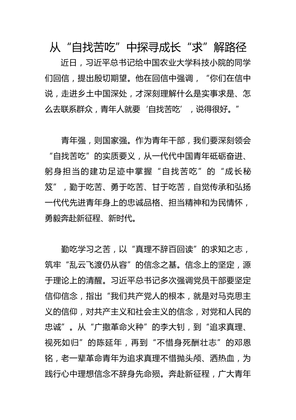 從“自找苦吃”中探尋成長(zhǎng)“求”解路徑近日,習(xí)近平總書記給中國(guó)農(nóng)業(yè)大學(xué)科技小院的同學(xué)們回信,提出殷切期望。他在回信中強(qiáng)調(diào),“你們?cè)谛胖姓f(shuō),走進(jìn)鄉(xiāng)土中國(guó)深處,才深刻理解什么是實(shí)事求是、怎么去聯(lián)系群眾,青年人就要‘自找苦吃’,說(shuō)得很好?!鼻嗄陱?qiáng),則國(guó)家強(qiáng)。作為青年干部,我們要深刻領(lǐng)會(huì)“自找苦吃”的實(shí)質(zhì)要義,從一代代中國(guó)青年砥礪奮進(jìn)、躬身?yè)?dān)當(dāng)?shù)慕üψ阚E中掌握“自找苦吃”的“成長(zhǎng)秘笈”,勤于吃苦、勇于吃苦、甘于吃苦,自覺(jué)傳承和弘揚(yáng)一代代先進(jìn)青年身上的忠誠(chéng)品格、擔(dān)當(dāng)精神和為民情懷,勇毅奔赴新征程、新時(shí)代。勤吃學(xué)習(xí)之苦,以“真理不辭百回讀...